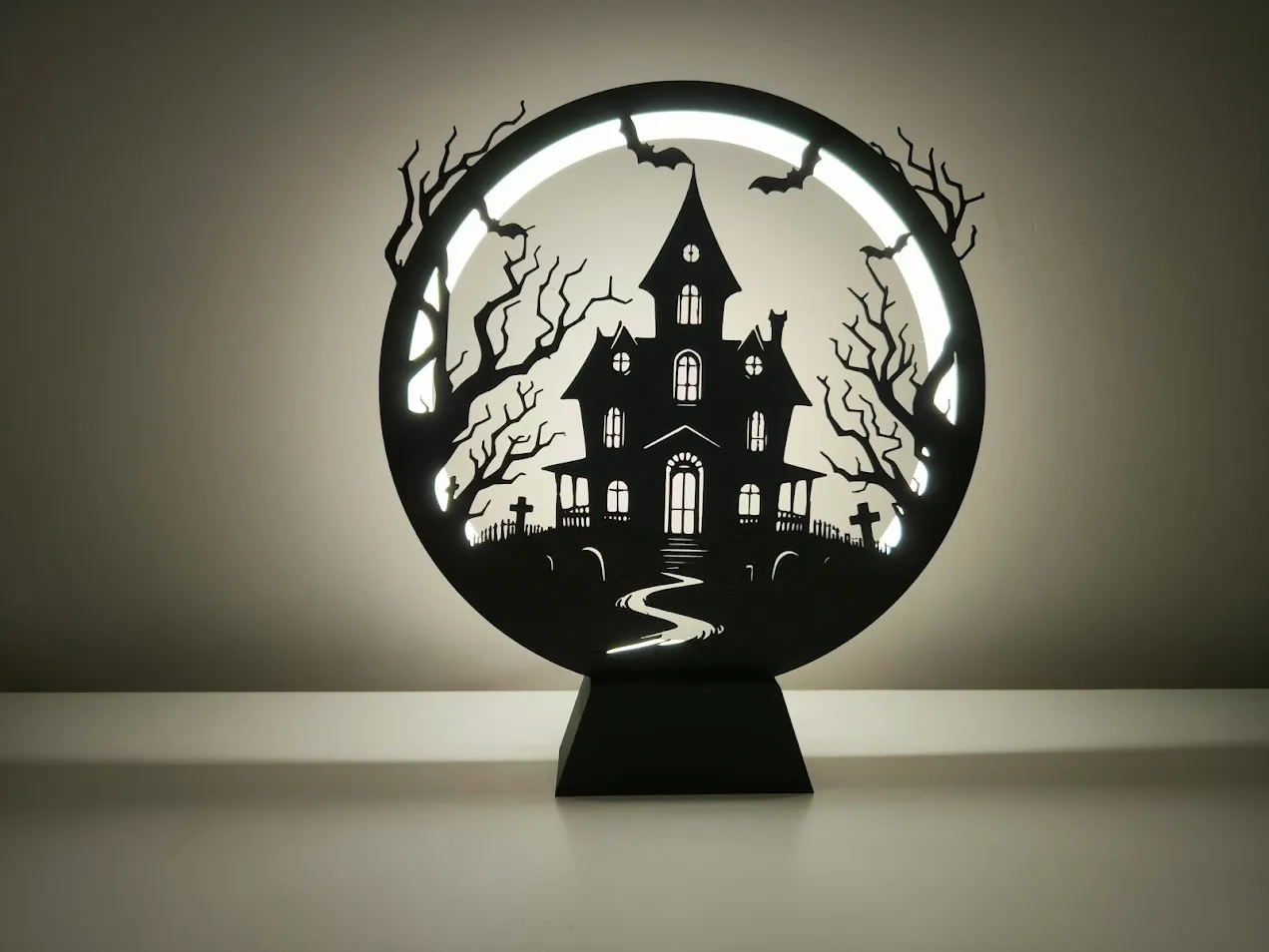 Sản phẩm này bao gồm phần khung đèn tròn và các tấm panel cắt laser 3D với hình ảnh ngôi nhà ma, nghĩa địa, cành cây khô và những chú dơi bay lượn, tạo nên một khung cảnh rùng rợn nhưng không kém phần bắt mắt. Khi bật đèn, ánh sáng xuyên qua các chi tiết cắt tạo nên một bức tranh nghệ thuật ấn tượng trên tường hoặc không gian xung quanh. Việc lắp ráp khá đơn giản, giúp bạn dễ dàng thay đổi các tấm panel tùy theo ý thích hoặc dịp lễ hội khác nhau.