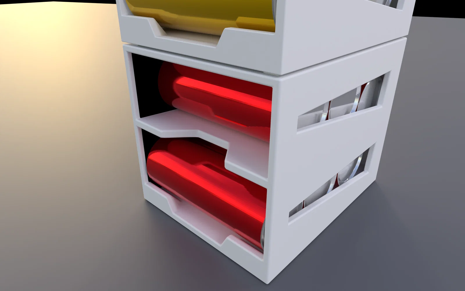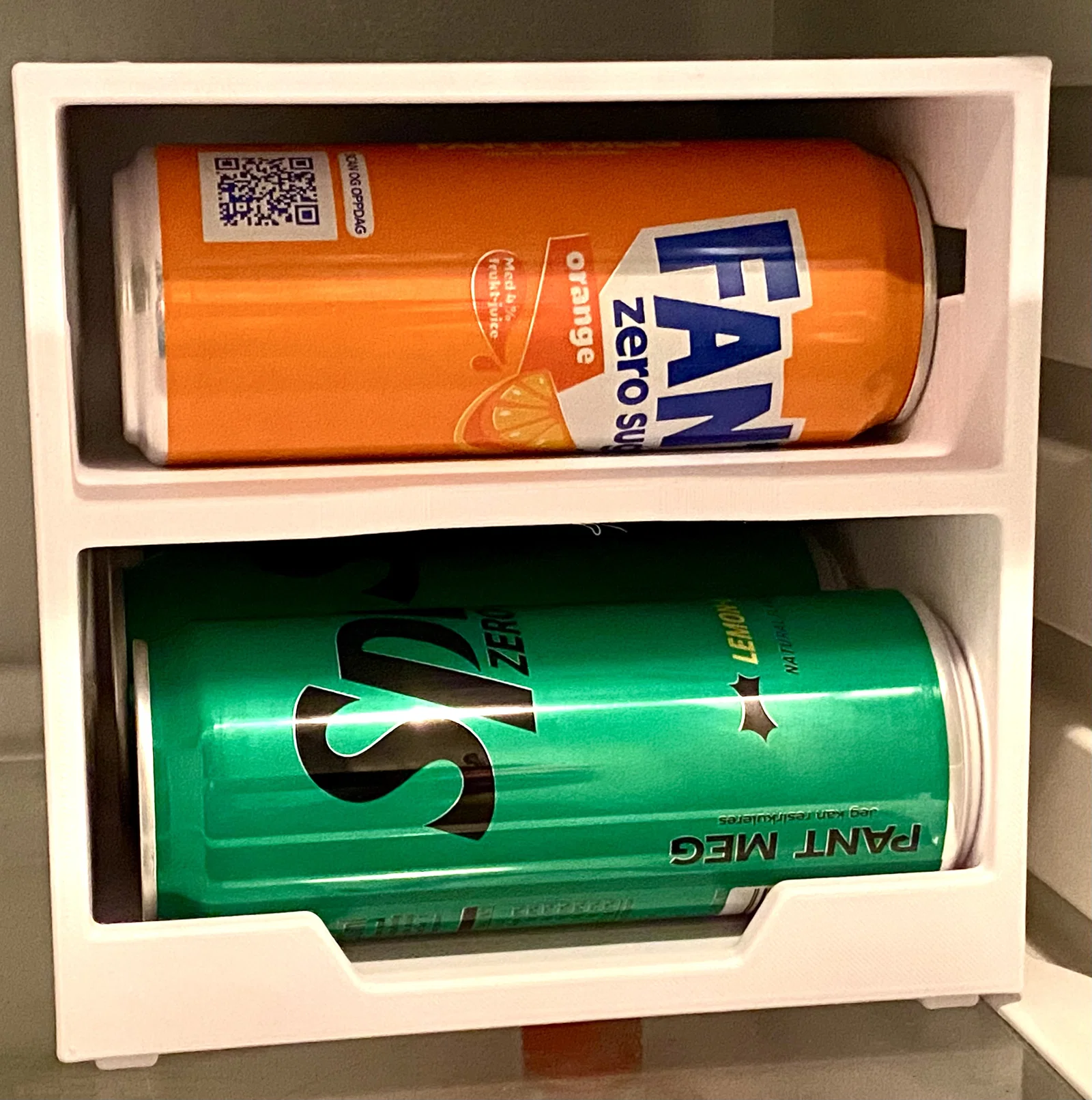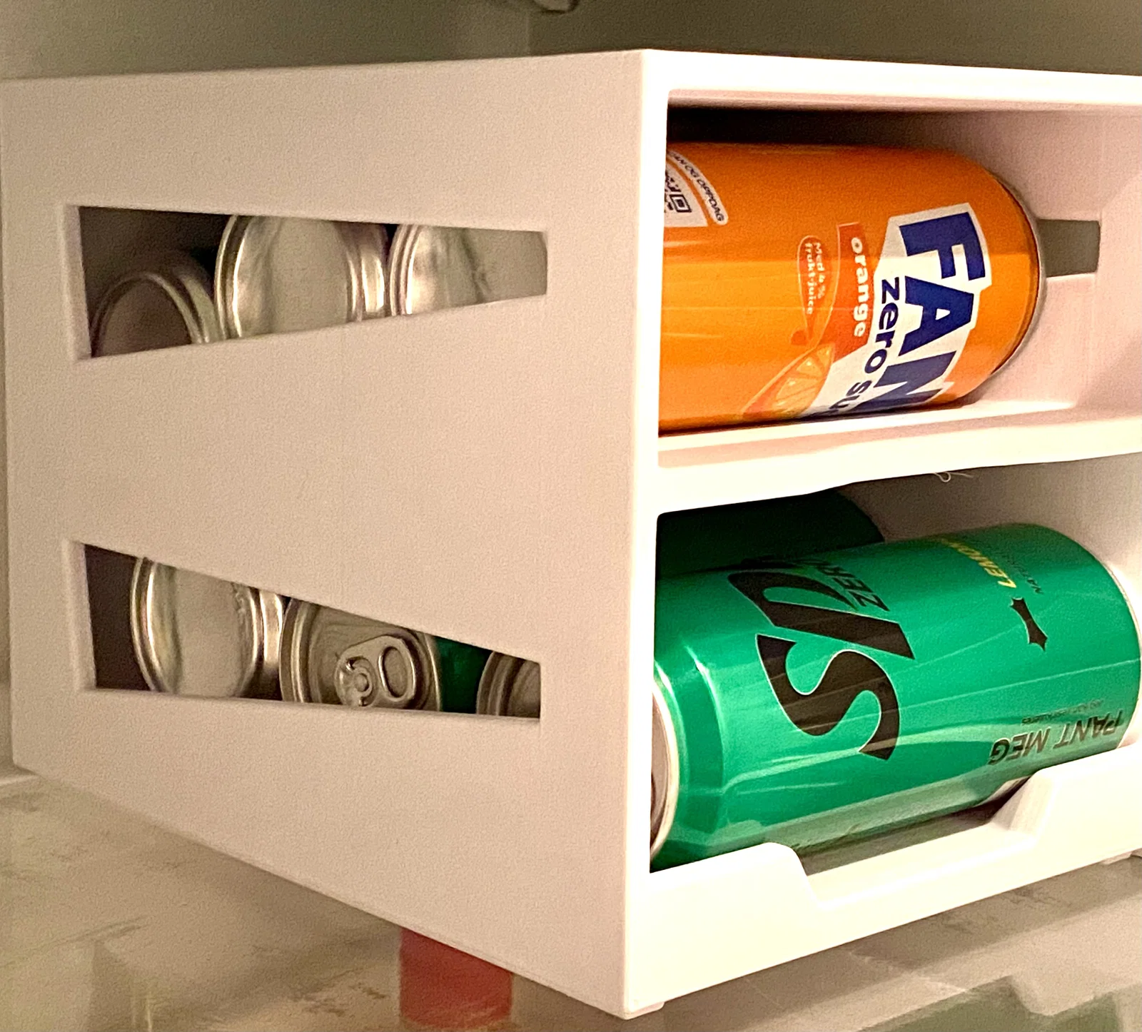 Khay nhả lon cho tủ lạnh, chứa vừa 6 lon 330 ml (58x146, dạng cao và thon). Thiết kế 1 mảnh, mặt trên phẳng để chồng đồ, có rãnh hỗ trợ xếp chồng. In không cần supports, úp mặt lưng xuống.