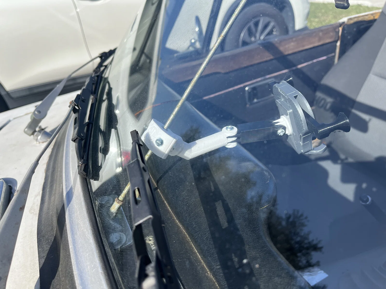 Mình cần một cái mount đặc biệt để giữ điện thoại chắc chắn trên chiếc MGB cổ của mình. Mình lấy một gravity phone holder rồi remix phần giải pháp gá lắp để kẹp vào trụ giữa (center post) của kính chắn gió MG. Mình dùng Prusa organic supports để in cái arm bản gốc ở góc 45° như yêu cầu. Mình không làm sao để cái threaded nut siết chặt được ball & socket đủ chắc, nên cuối cùng mình phải dùng keo siêu dính (super glue) dán cứng cái phone holder ở đúng góc. Có thể mình có thể canh bằng shim, nhưng mình không cần chỉnh góc linh hoạt. (Bản cập nhật bên dưới đã xử lý vấn đề này)