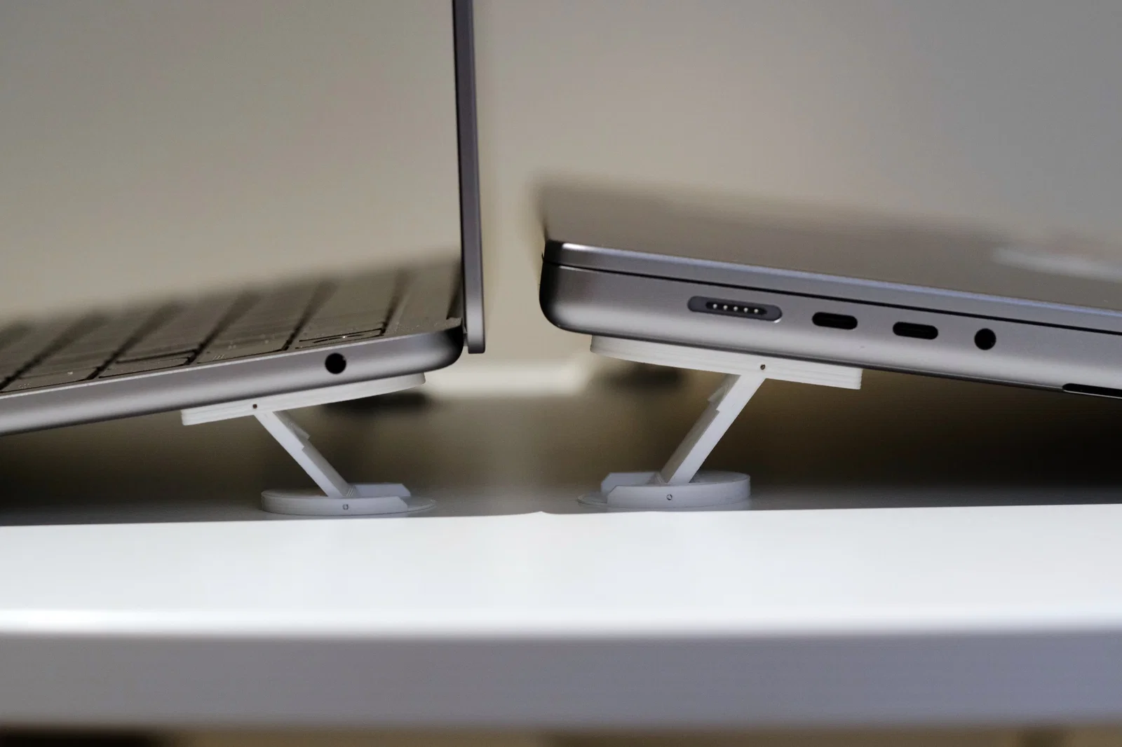 Mình thiết kế bộ chân này sau khi chạy vài ứng dụng khá nặng trên MacBook Air M3 và để ý máy nóng lên rõ. Tiêu chí chính là giữ thiết kế cong, mượt, nhìn gọn nhưng vẫn bền và nhỏ gọn.