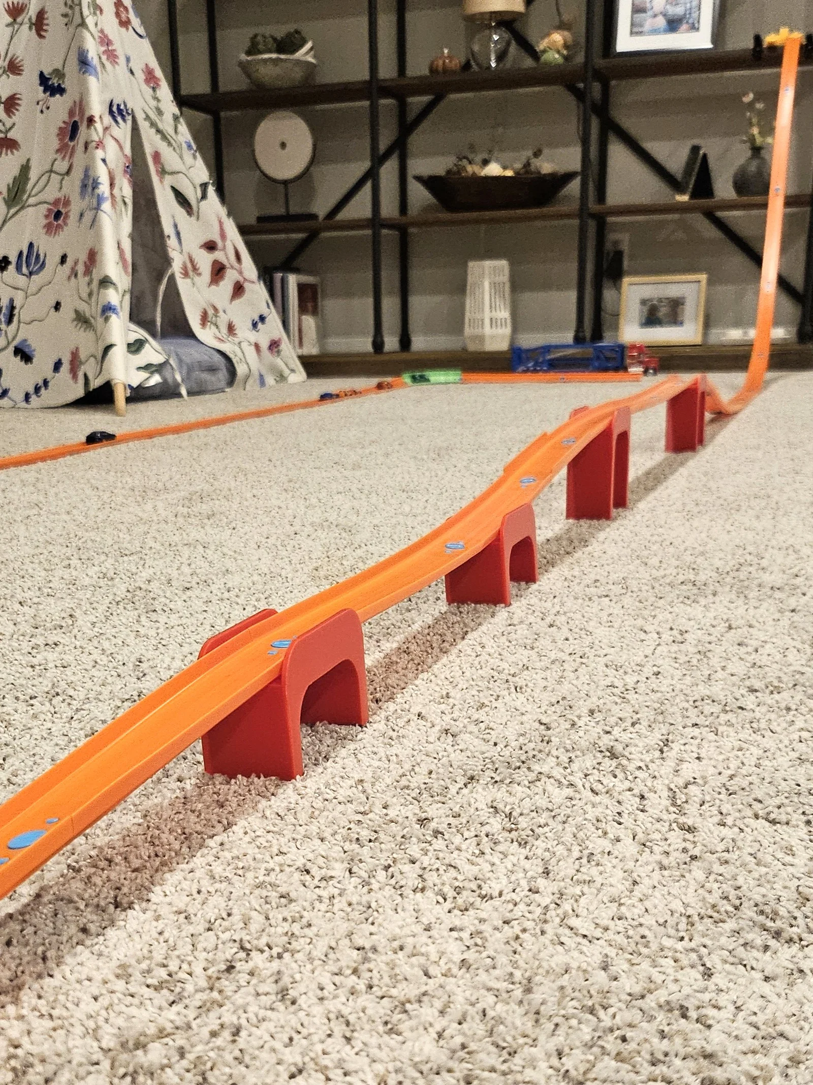 Đây là một chi tiết support đơn giản, dùng chung với đường track Hot Wheels để tạo đoạn vượt (overpass) và cầu. Mình in bằng PLA với 2 perimeters, 20% gyroid infill và snug supports (xem hình Make). Mình dùng mấy cái này với một bộ track tương đối rẻ mình mua trên Amazon: