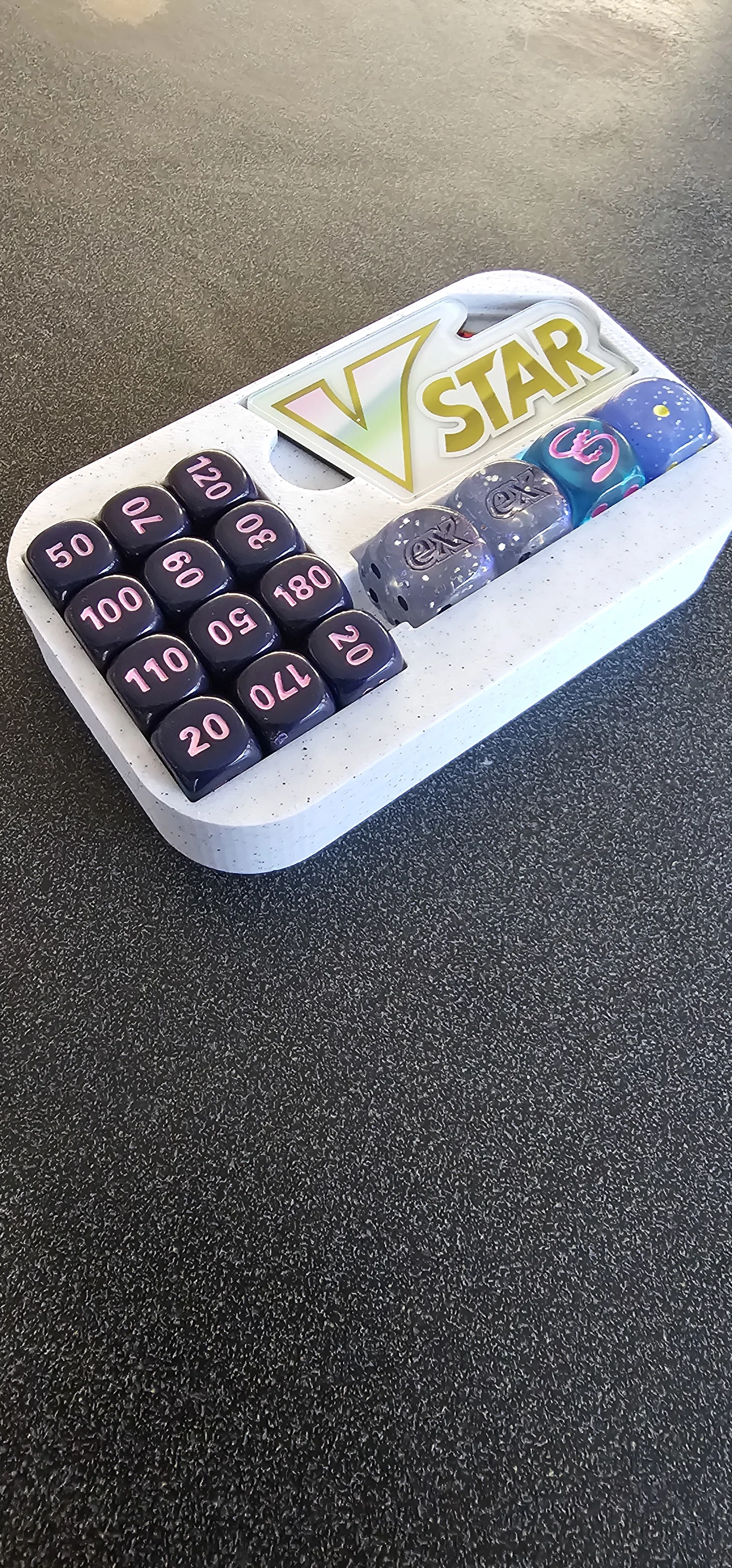 - Sức chứa đa năng: Khay hỗ trợ chứa tối đa 12 viên xúc xắc đánh dấu sát thương (damage counters), 4 viên xúc xắc D6, 2 đồng xu (phù hợp cho các loại đồng xu đánh dấu trạng thái burn/poison có đường kính tối đa 32mm) và vị trí chuyên biệt cho token V-star.