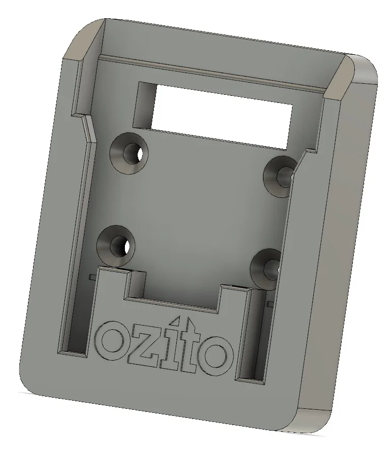Mẫu Ozito PXC Battery Mount \ Breakout dùng để gắn pin Ozito PXC (PXC18V) và breakout kết nối. Phù hợp để in 3D, hỗ trợ bố trí nguồn pin gọn gàng cho dự án DIY/bench setup.
