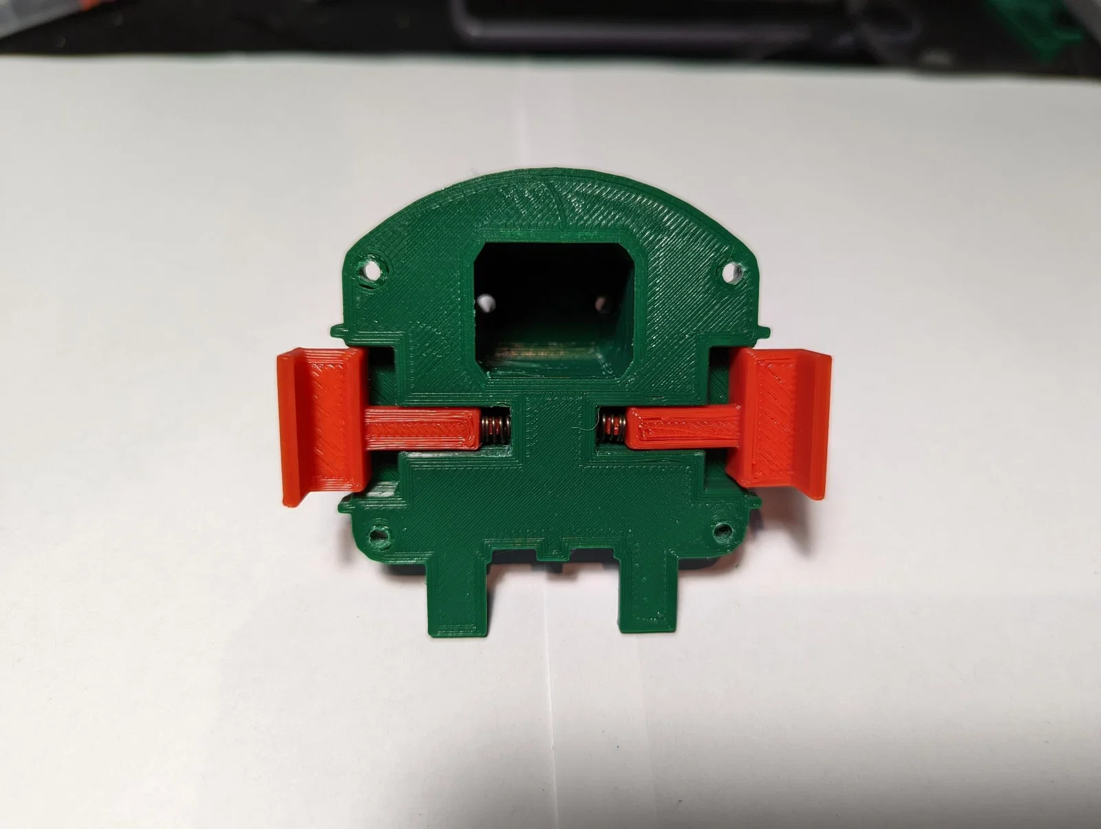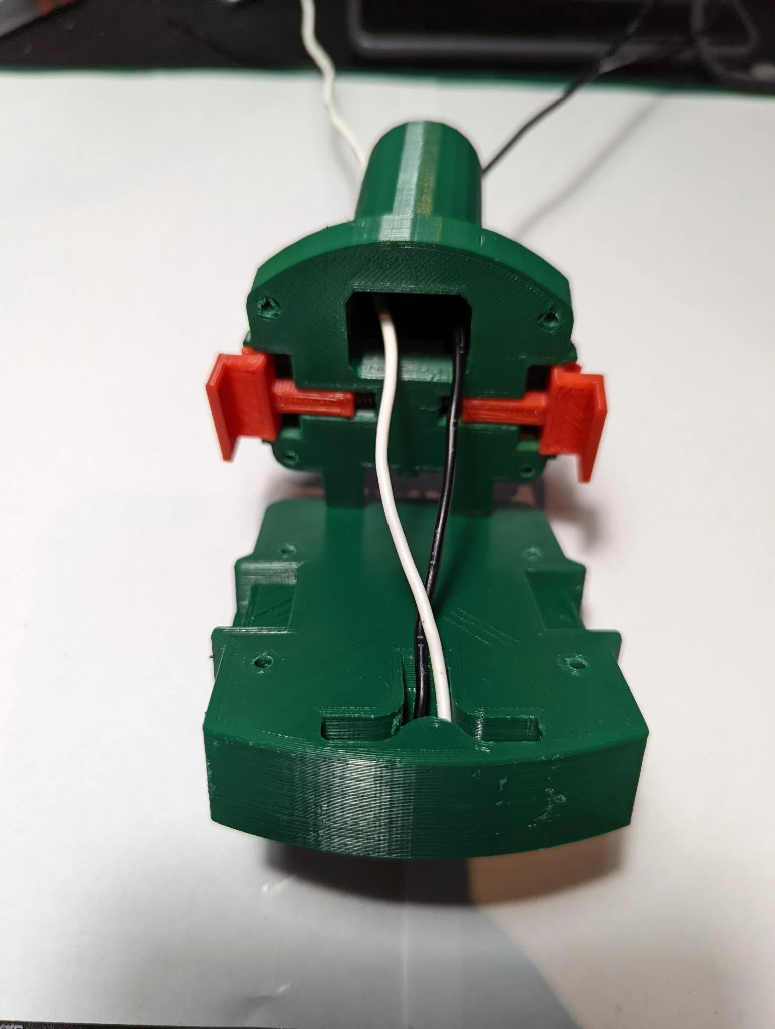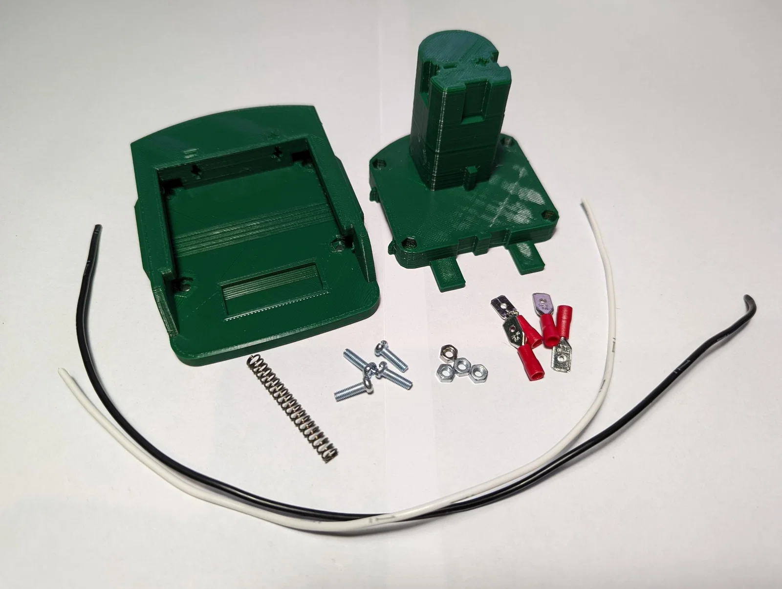 Lắp lò xo và các nút (buttons) vào tấm trên (top plate), rồi luồn dây vào đúng các lỗ tương ứng bên trong đi lên phần Ryobi đực (male Ryobi section). Sau đó bắt vít tấm trên xuống tấm đế, đồng thời đảm bảo kéo dây xuyên lên để giảm phần dây dư (slack) bên trong adaptor.