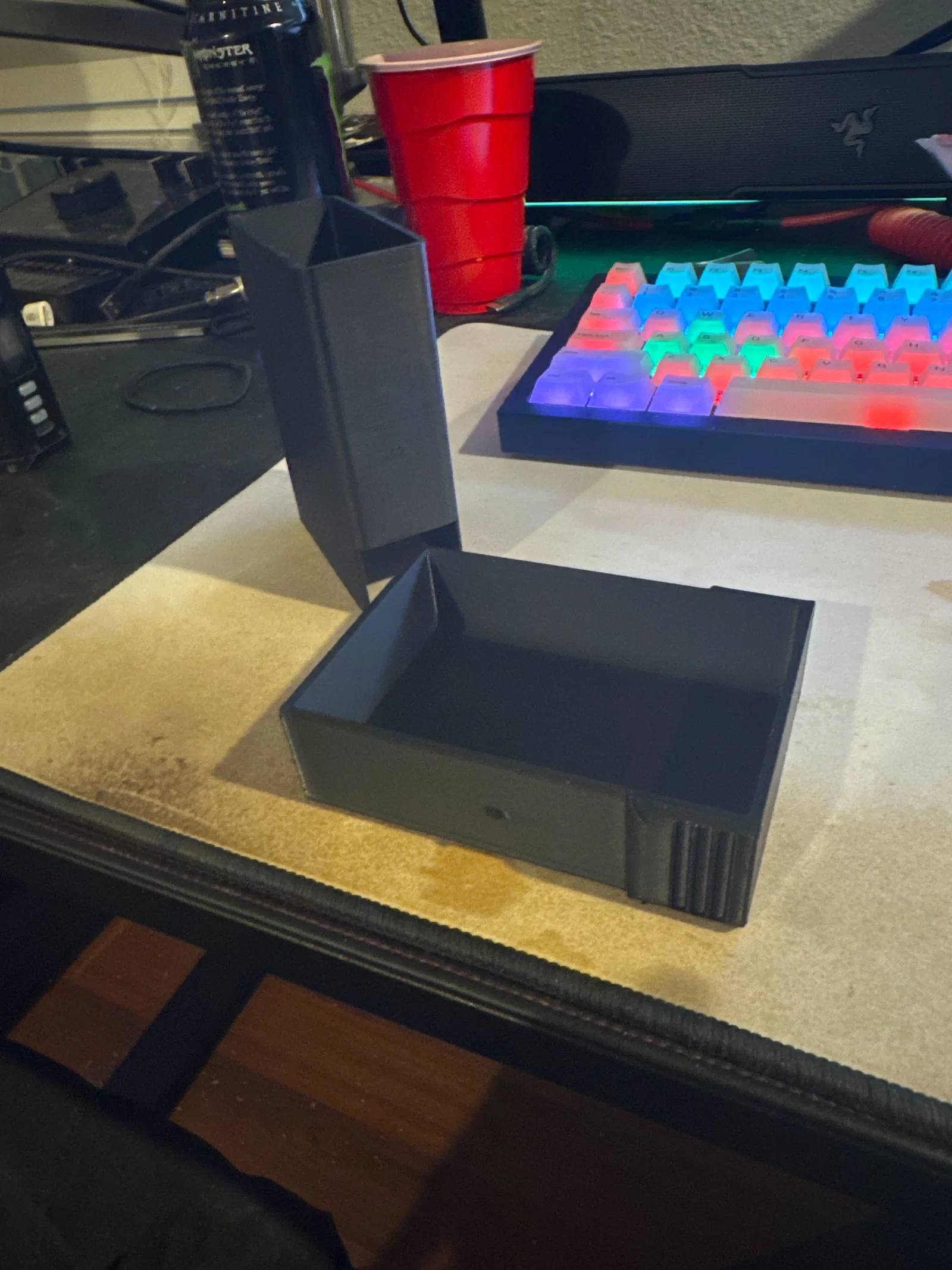 Hộp thuốc lá dạng trượt gồm 2 phần, size vừa, chứa tối đa 24 điếu thuốc lọc 100mm. Có sẵn STL và tham số để dễ chỉnh số ống, đường kính/khoảng hở; khuyến nghị in inner shell nằm phẳng, outer shell úp và dùng brim.