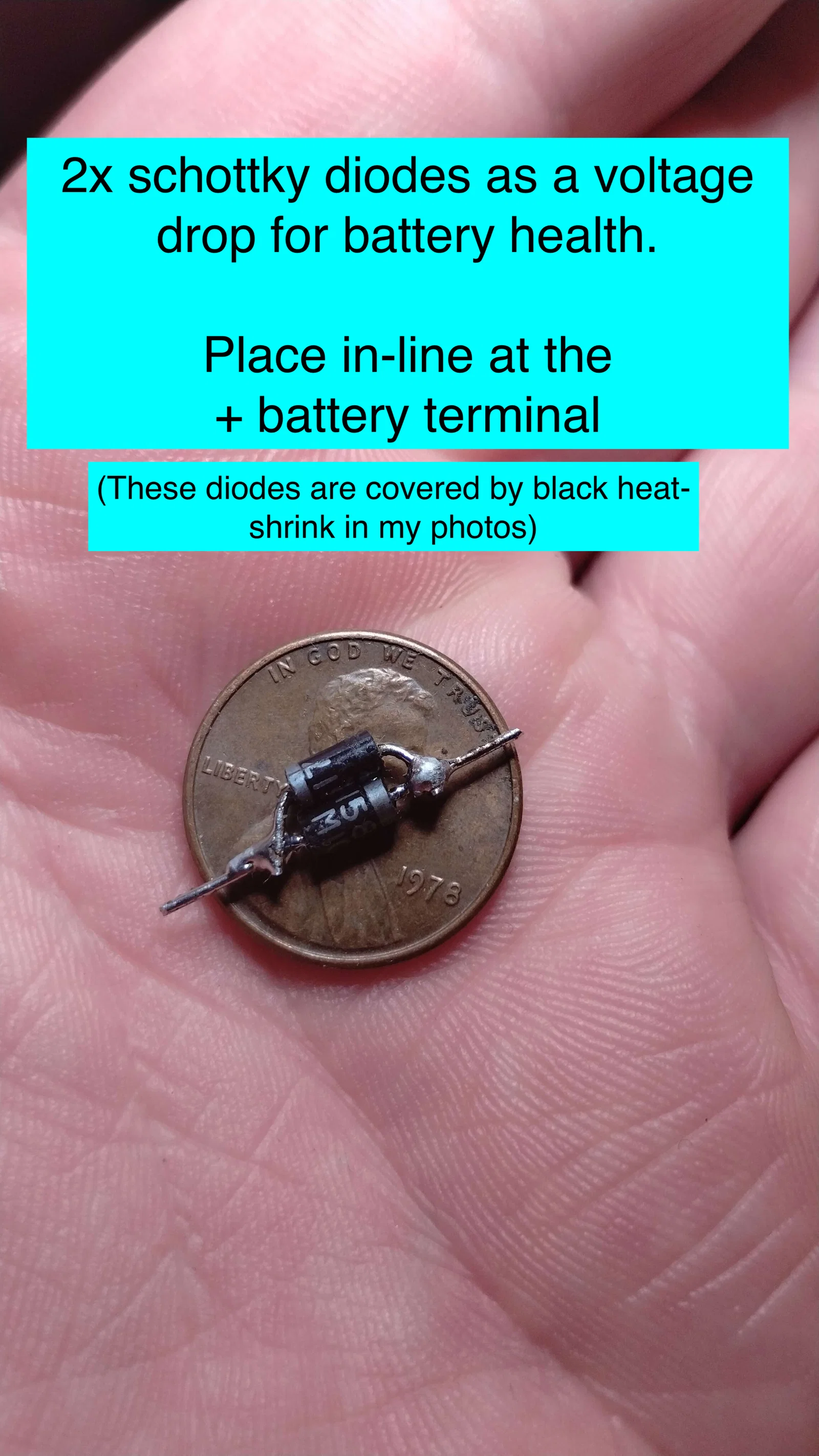 - Có một cải tiến nữa là dùng 2x schottky diode để tạo sụt áp, giúp pin không sạc lên 100%. Cách này giúp kéo dài tuổi thọ pin li-ion đáng kể và rất nên làm! Mắc nối tiếp trên đường từ solar board sang battery +, đặt 2x diode song song nhưng đảo chiều nhau (để dòng có thể chạy theo cả hai hướng và bạn vẫn có sụt áp trên cụm diode). Xin lỗi hướng dẫn mình viết hơi tệ, chắc để bữa nào mình cập nhật lại (-: