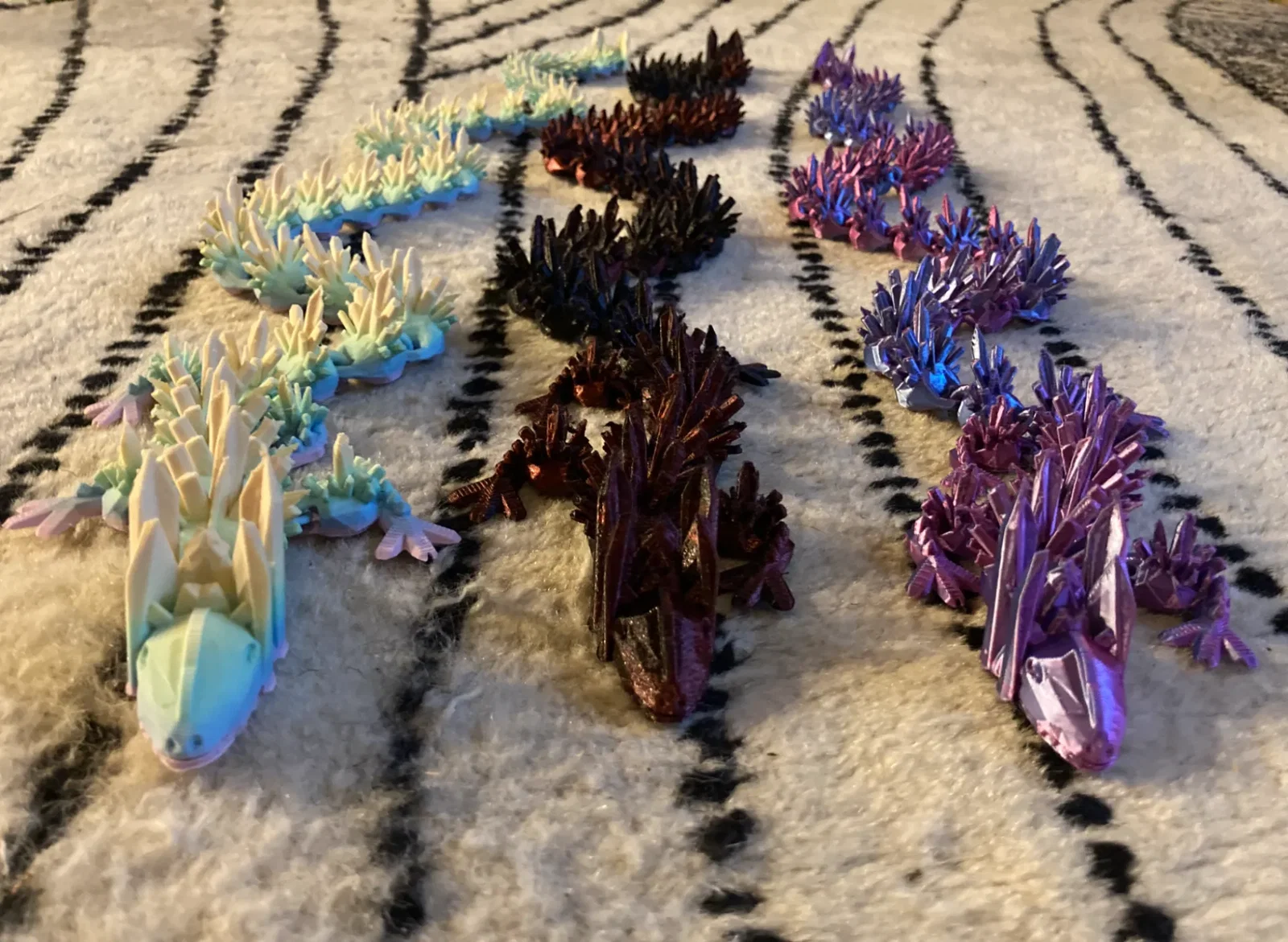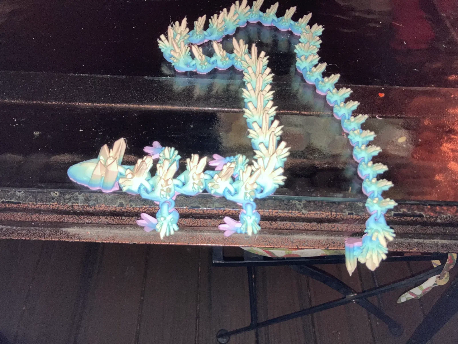 Mẫu rồng pha lê dài 33 inch bản extra flexi rustic, khớp nối linh hoạt. Có thể dùng làm fidget, đồ trang trí, quà tặng, đồ chơi hoặc đeo quanh cổ. Khuyến nghị in kèm brim; ai in máy lớn thử max size cho mình xin kết quả.