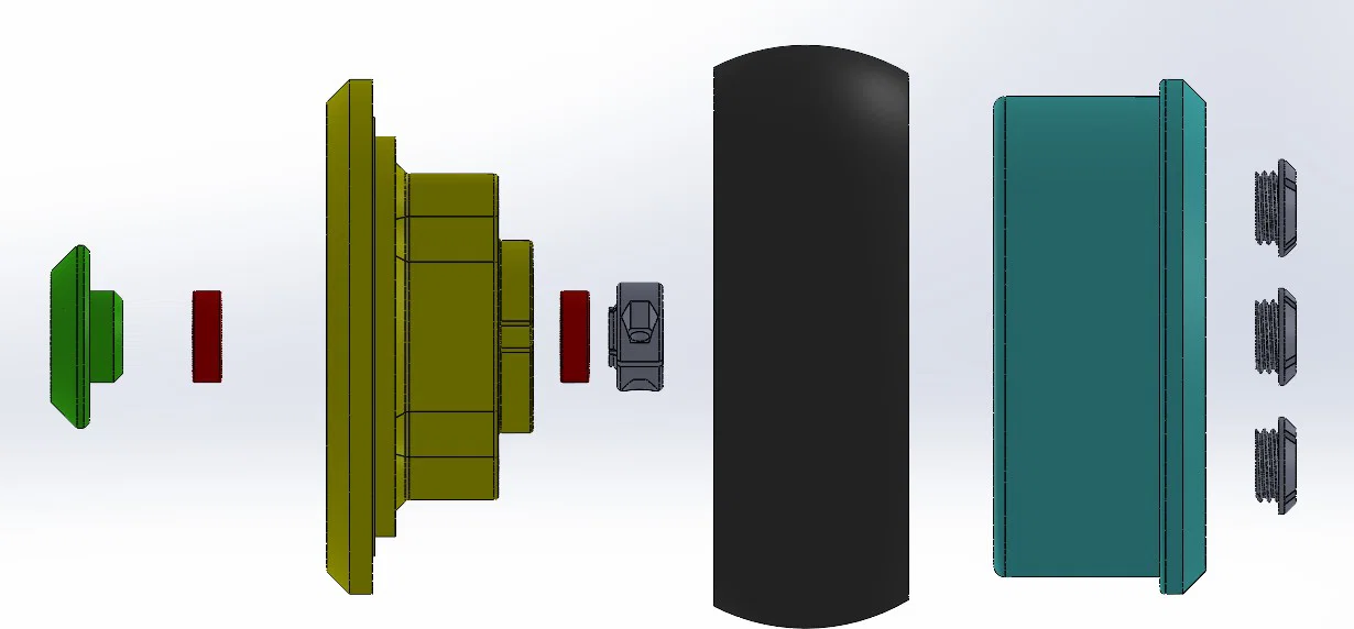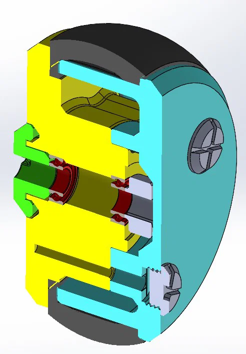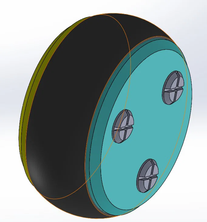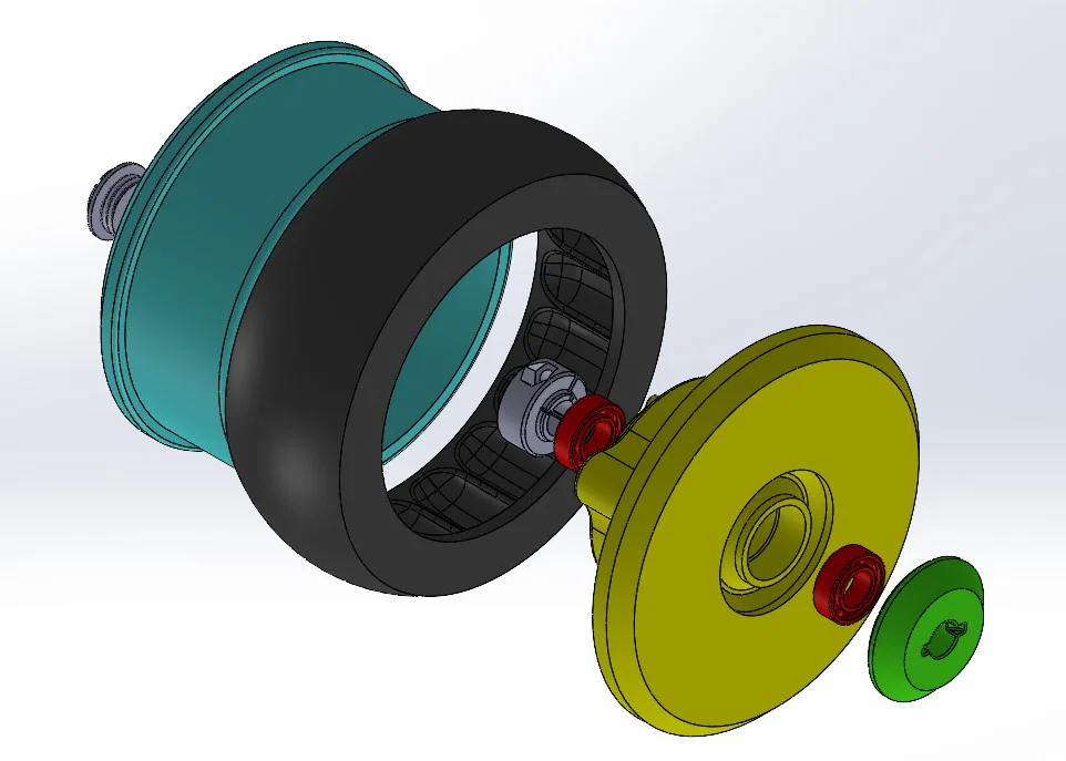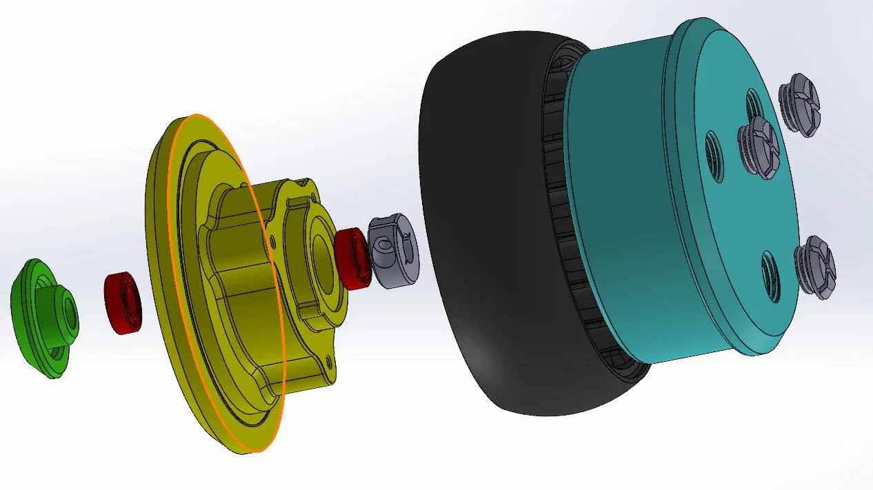 Để in các chi tiết này, khuyến nghị dùng PET-G. Để khít hơn, hãy in ở tốc độ 50 mm/s và tăng nhiệt độ nozzle. Dùng vít tự ren (25–35 mm) như minh hoạ trong hình. Lốp zin có thể tái sử dụng nếu còn tốt. Ngoài ra, có thể dùng TPU để in.