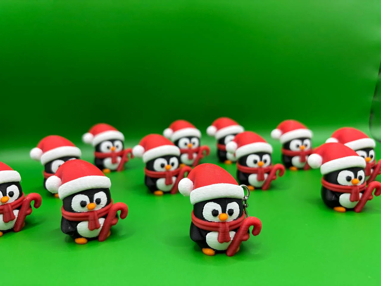 Móc khóa Chim Cánh Cụt Giáng Sinh 3D dễ thương: đội mũ Noel, quàng khăn và ôm kẹo gậy. In PLA thân thiện môi trường, nhỏ gọn, nhẹ và bền—phù hợp làm phụ kiện mùa lễ hoặc quà tặng xinh.