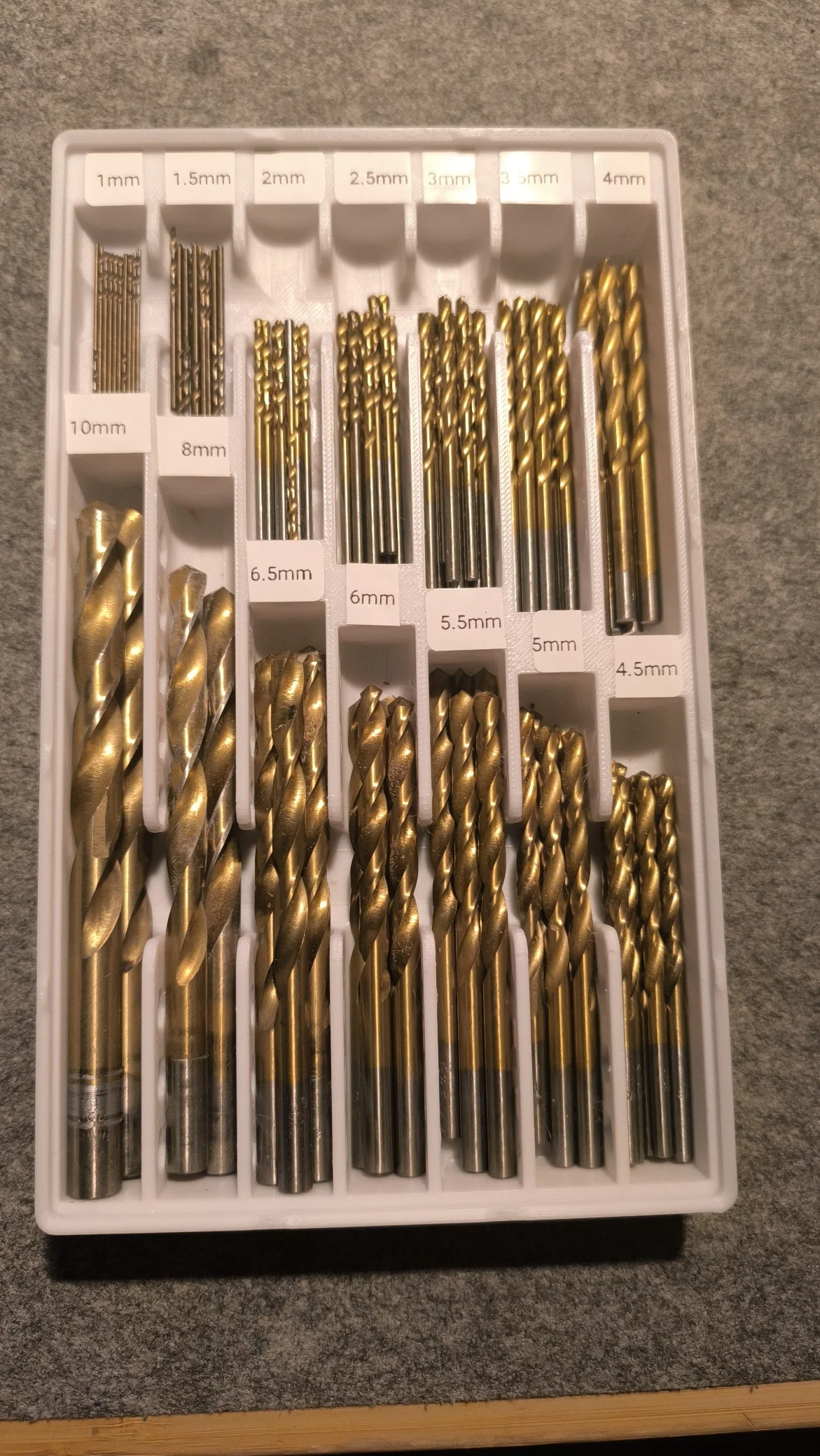 Khay Gridfinity đựng mũi khoan hệ metric, thiết kế cho bộ mũi khoan FERREX mua ở Aldi nhưng cũng dùng tốt với nhiều bộ khác. Tiết kiệm không gian, có sẵn chỗ để dán/in label bằng máy in 3D hoặc 2D.
