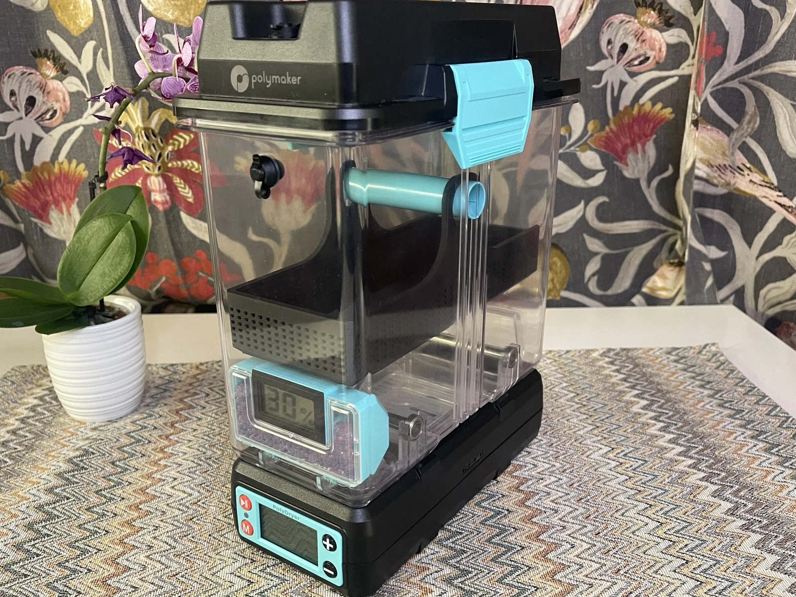 Lưu ý là bạn cần in bằng vật liệu chịu nhiệt cao hơn tuỳ theo mức nhiệt bạn dùng trên PolyMaker PolyDryer. In PETG rất ổn và vẫn chịu được Heat setting số 3 trên PolyDryer. Thời gian sấy có thể lâu hơn nếu khay có nhiều hạt hơn. Mình khuyên sau vài giờ sấy nên đảo hạt trong khay để mỗi hạt được sấy khô đều.
