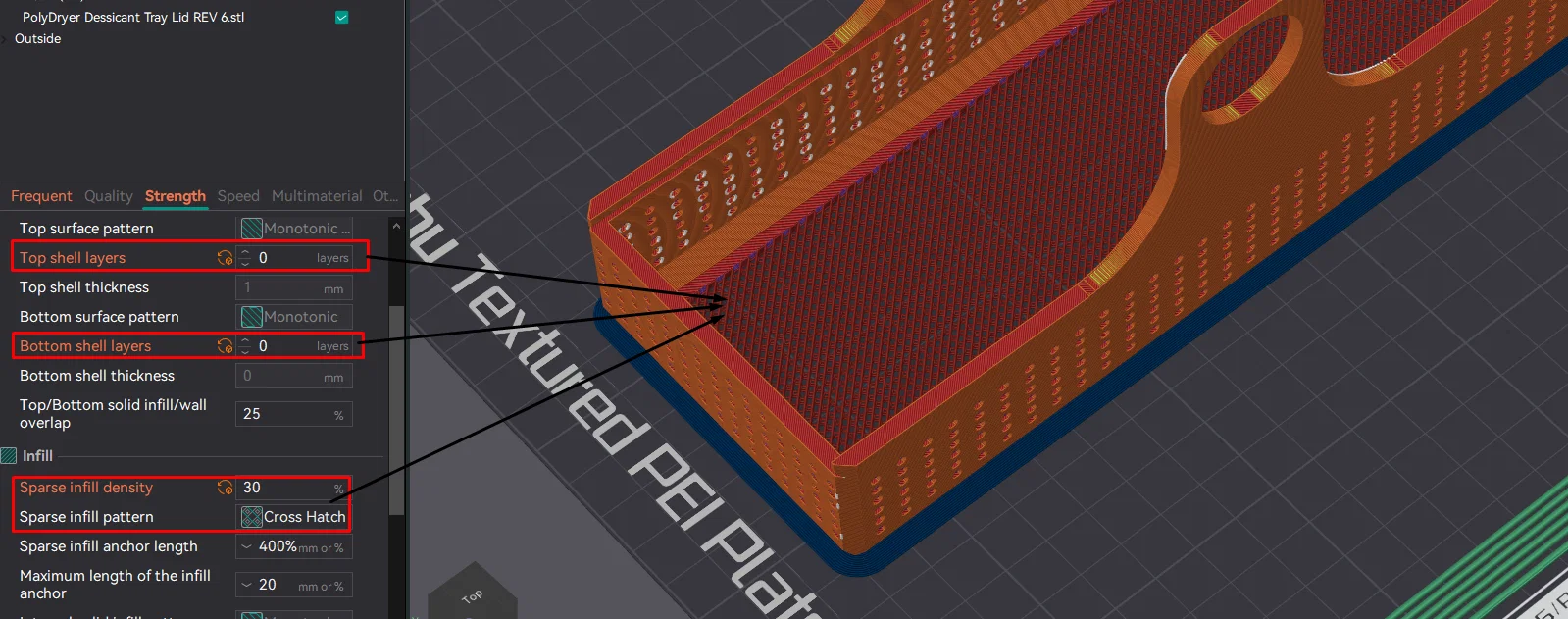 - QUAN TRỌNG: hãy thêm một print modifier cho phần đáy của khay và đặt Top shell layers và Bottom shell layers về 0, đồng thời tăng sparse infill density lên 25–30% để đảm bảo khay được thông gió đúng cách. Tham khảo hình 7/7!