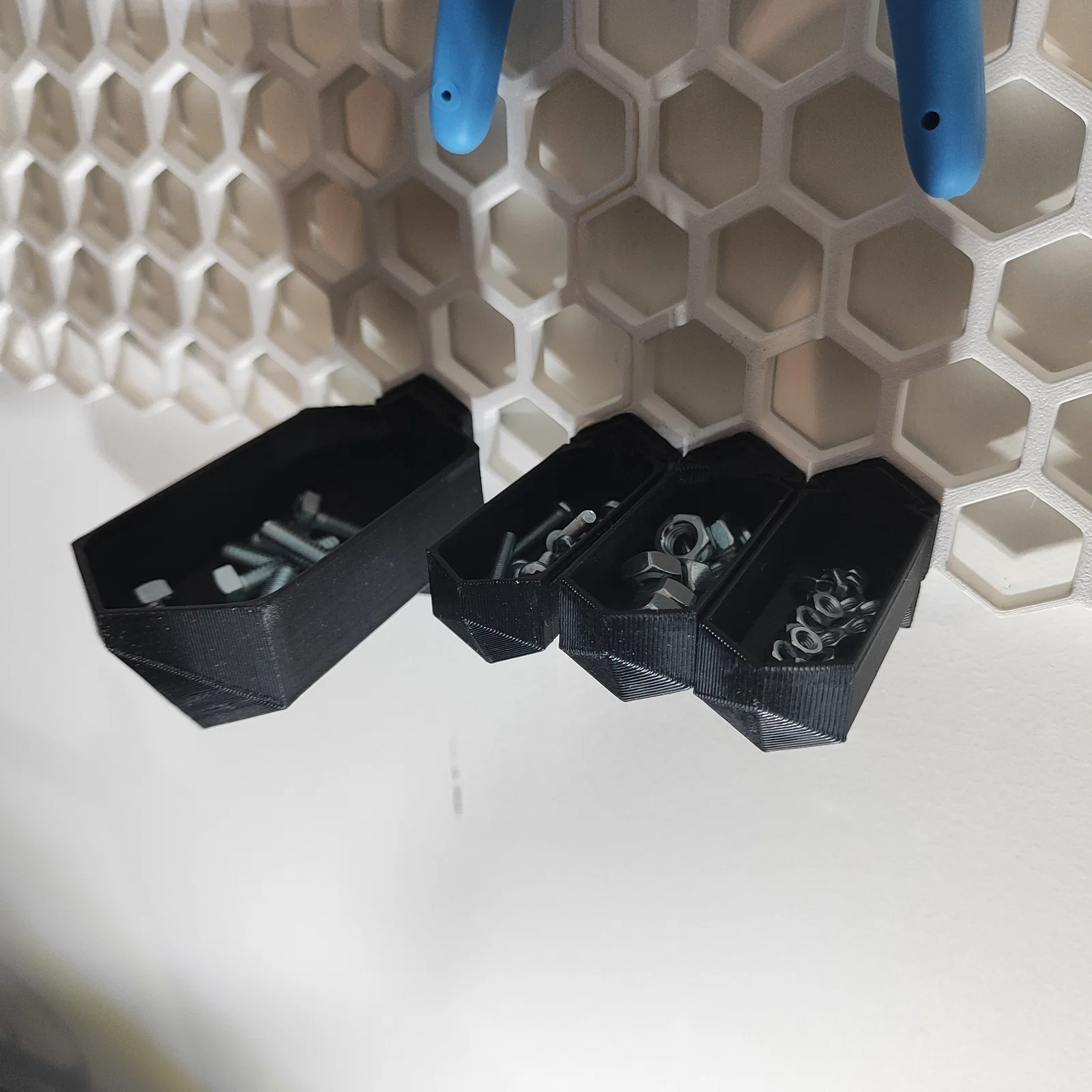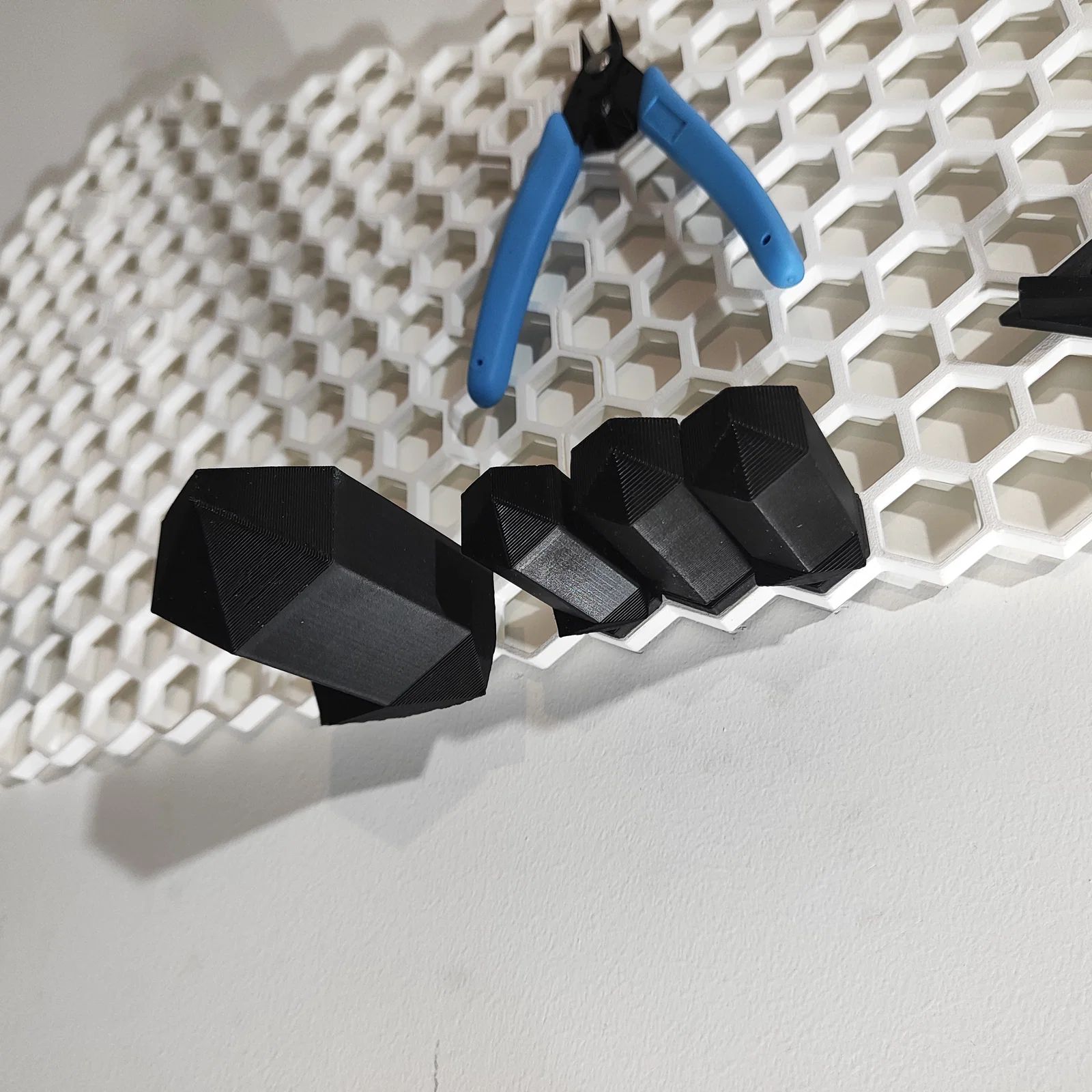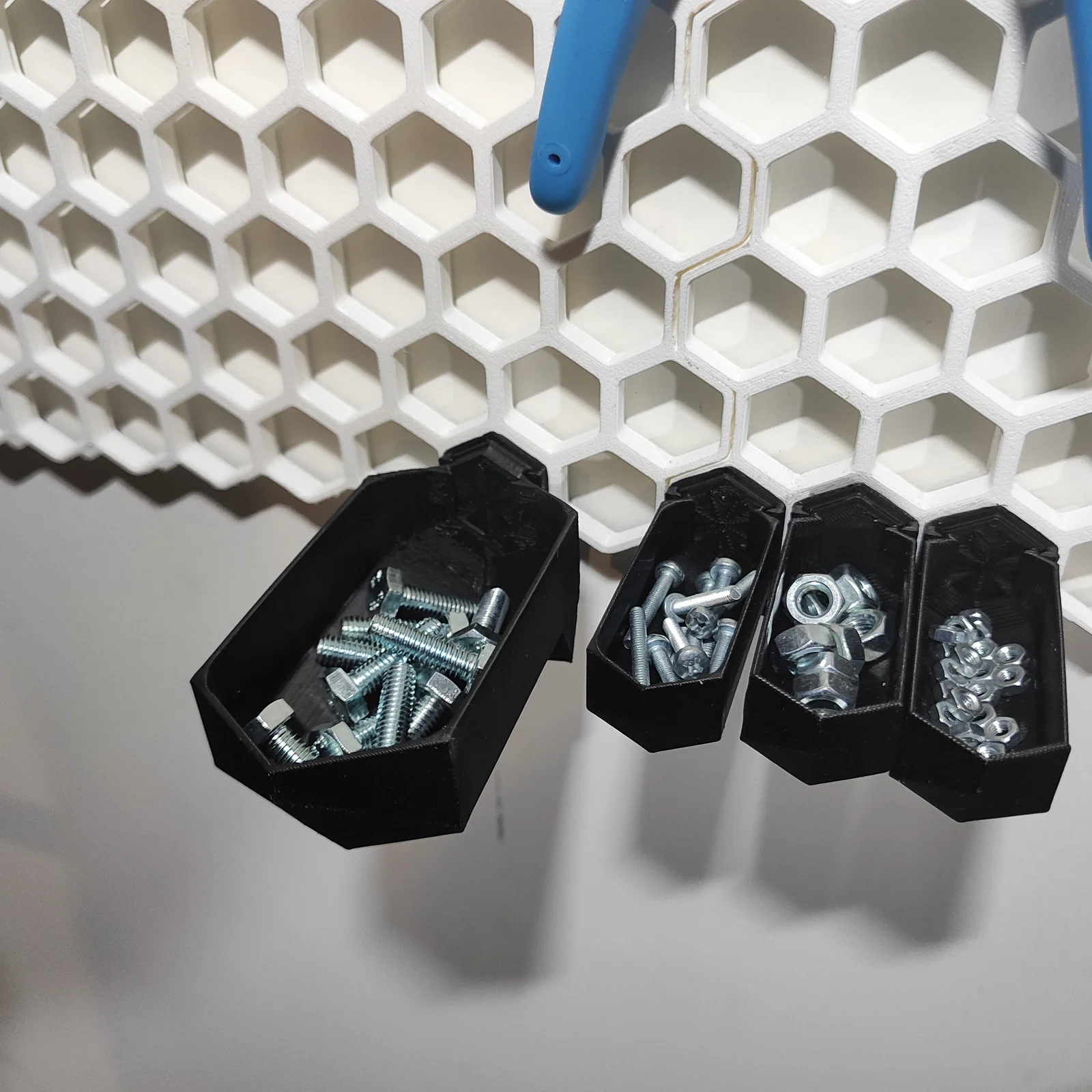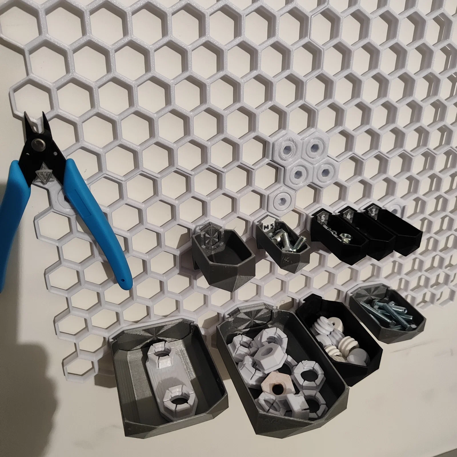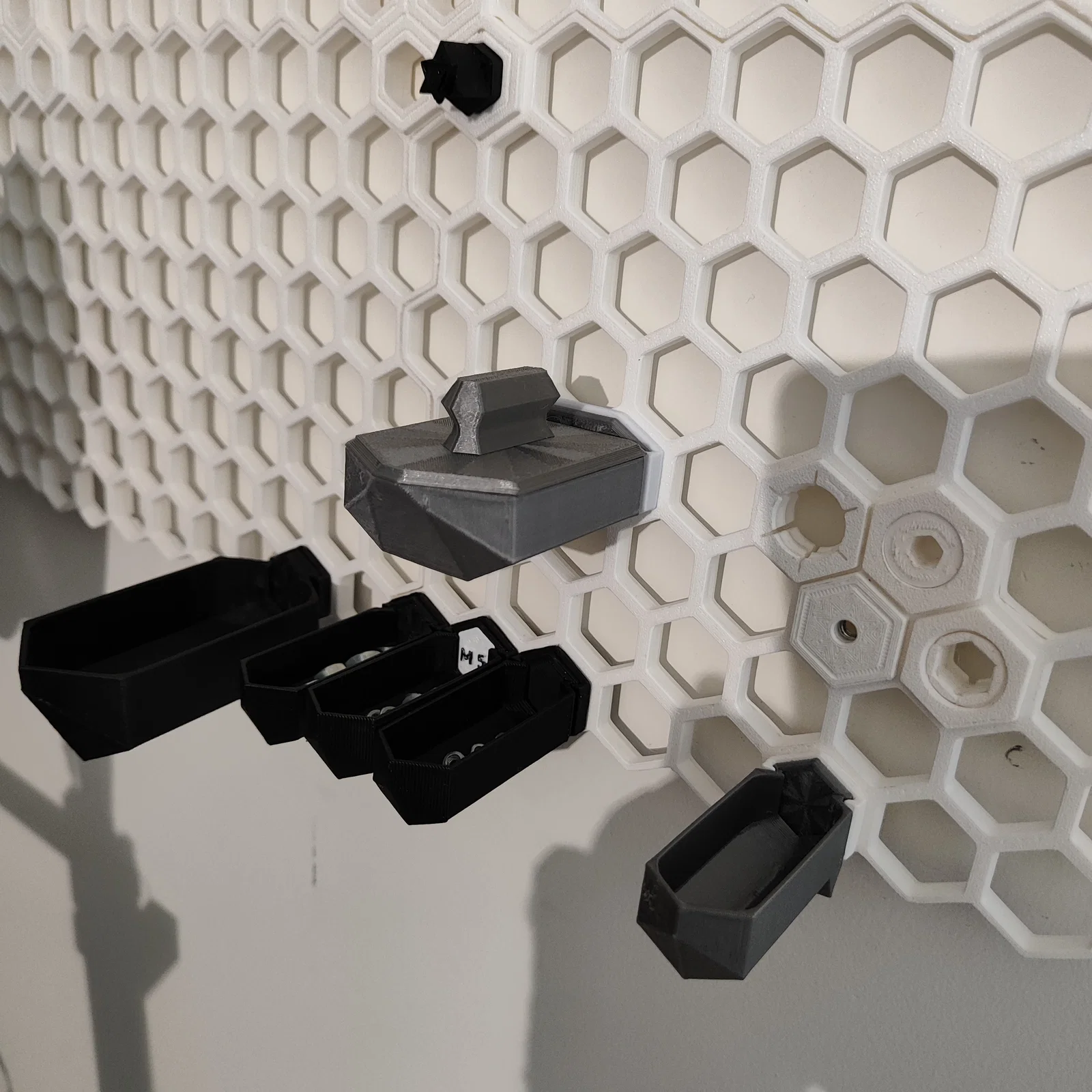 Bộ HEX BOXES dạng lục giác cho Honeycomb Storage Wall (HSW) kèm holder, thiết kế modular dễ sắp xếp và tháo lắp. Có rãnh gắn nhãn phía sau, dễ lấy đồ, in phần lớn không cần supports và có thêm lids.