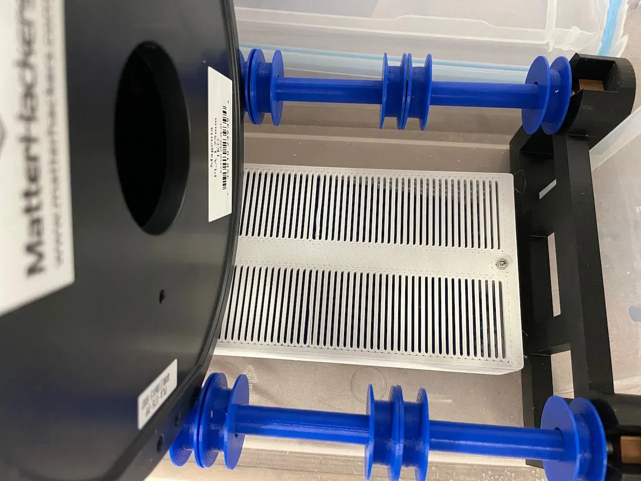 Tôi đã tạo ra cái hộp chứa hạt silica gel này để vừa vặn ở đáy của hộp khô filament bên dưới cuộn dây. Nắp có thể nâng lên từ trên cùng và có thể đổ hạt vào.