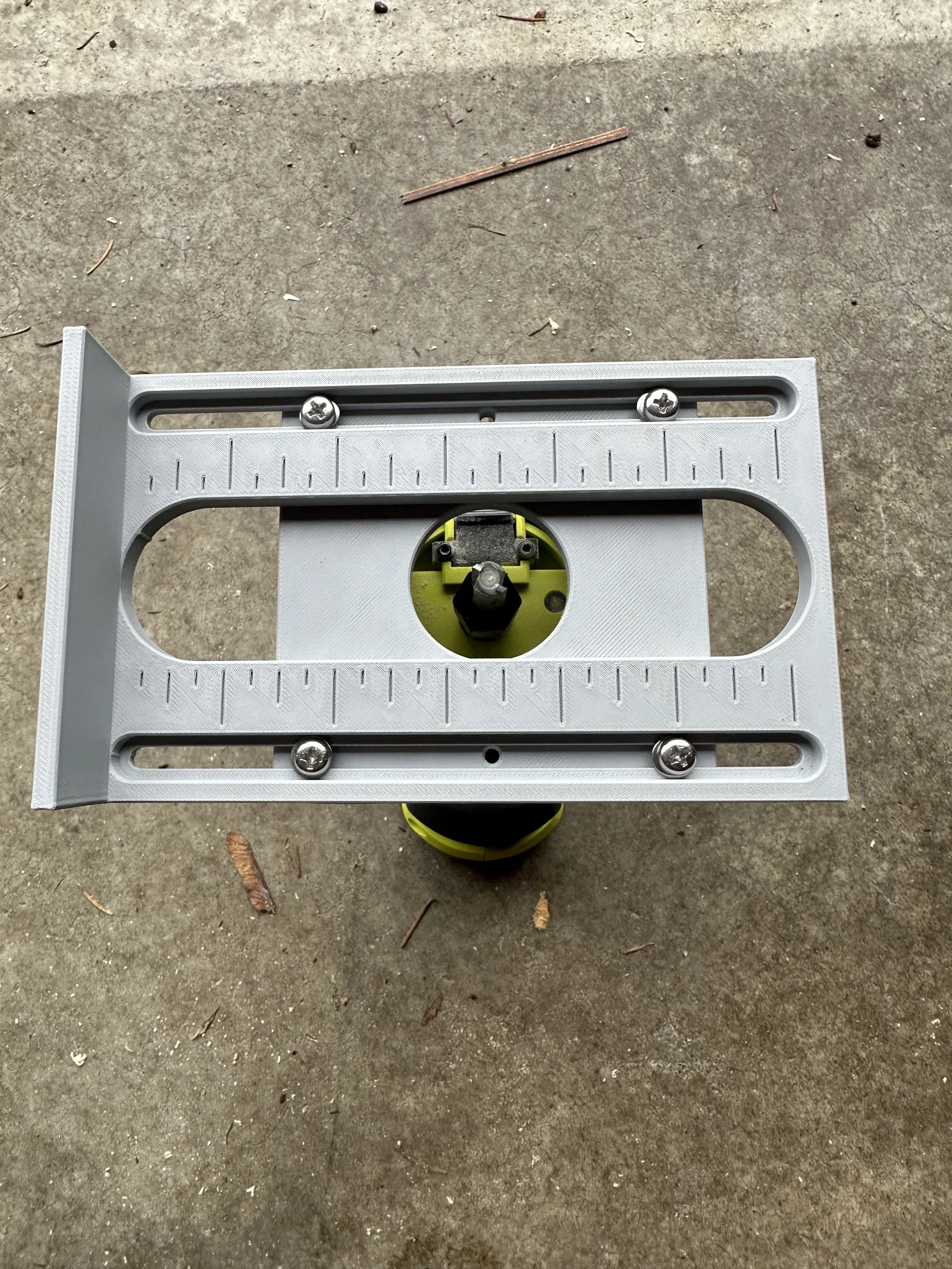 Thanh dẫn cạnh trượt 6" cho Ryobi Compact Fixed-Base Router (mẫu #PCL424B), gắn với đế vuông 4". Cho phép phay cách mép tới 6", có thước canh chỉnh. Khuyến nghị in PETG, 100% infill để siết vít chắc.