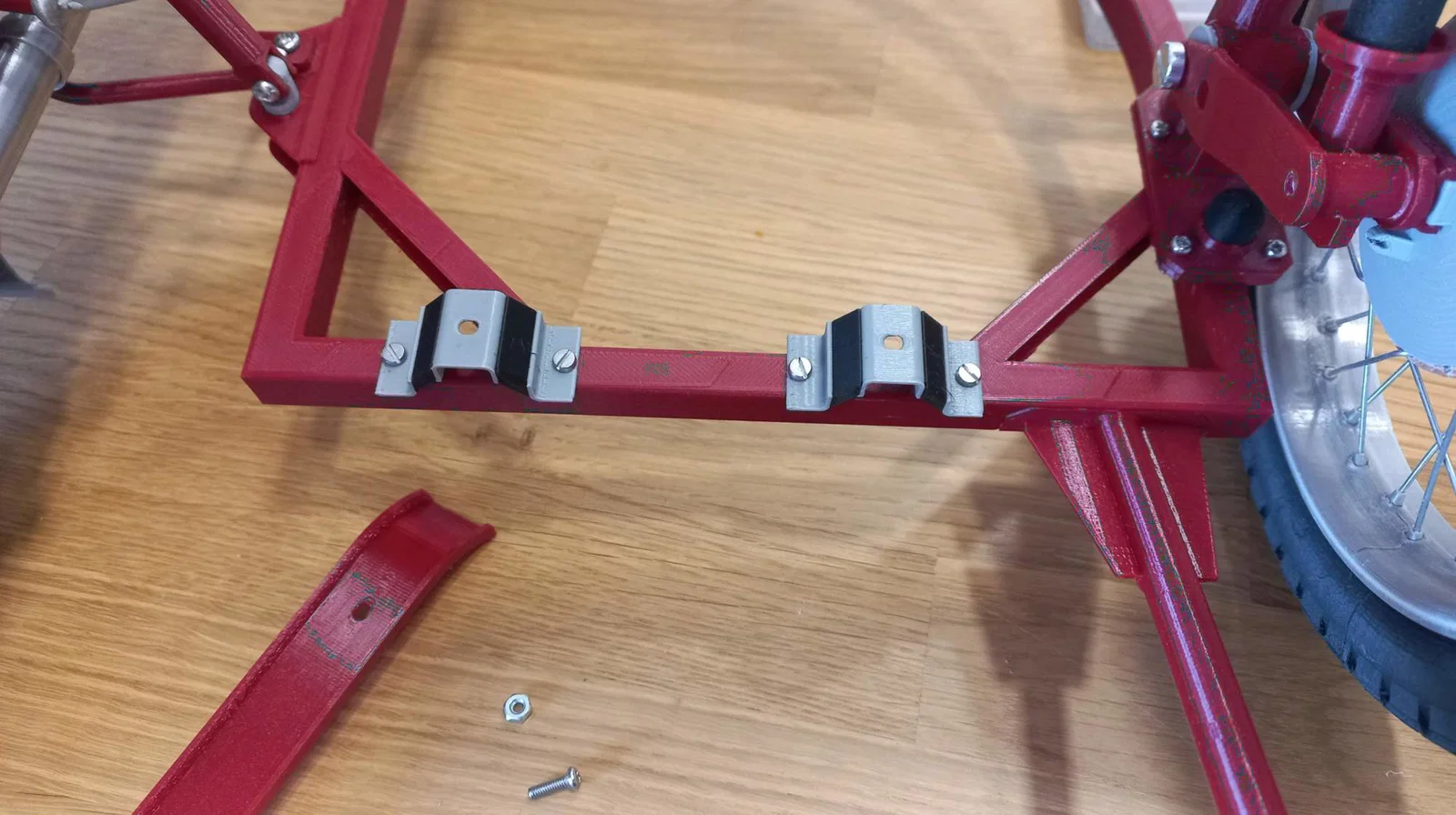 - Làm bánh trước từ phần số 7 của bộ xe máy, kèm bộ brake shield hoàn chỉnh. Bánh này trượt vào thanh ren (threaded rod) trên wheel suspension và siết bằng ê-cu thấp M4 kèm shim.