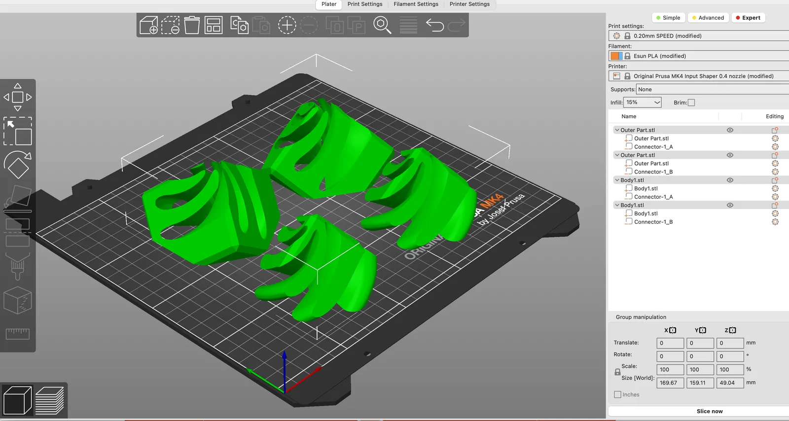 Sau một thời gian thử nghiệm và nhiều lần in hư, mình quyết định cắt chính xác cả hai phần ngay trong Prusa Slicer, nhờ vậy in ra sạch và không cần supports. Mình cũng chỉnh X-Y Size Compensation về -0.4 hoặc -0.5 để có khe hở (clearance tolerance) đẹp và mượt giữa các phần sau khi lắp.