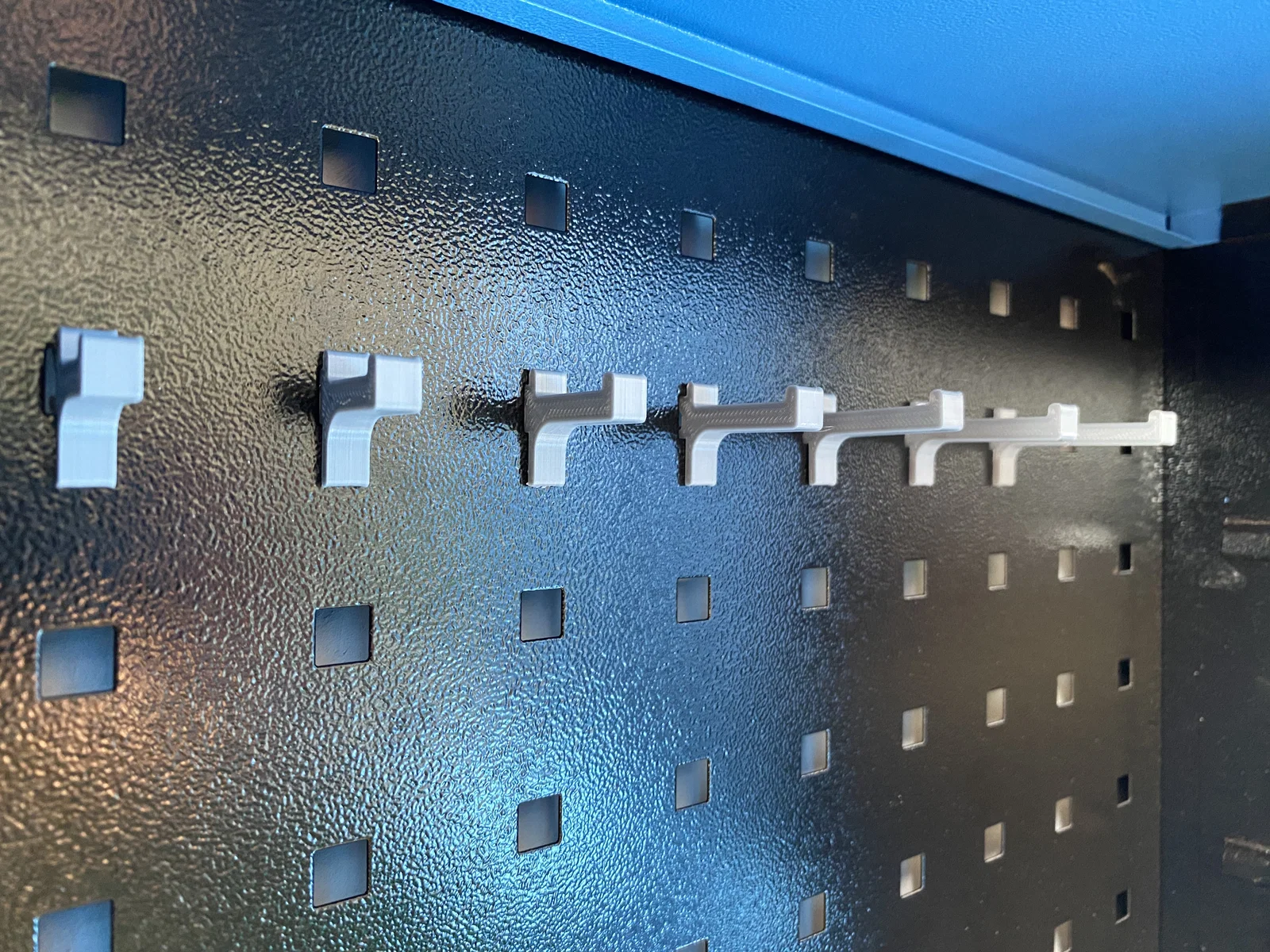 Bộ hák nhiều kích thước để gắn vào tủ treo dụng cụ (ví dụ tủ GÜDE lỗ 9x9mm). In dễ, không cần support. Thông số tham khảo: PLA, 3 outer perimeters, 5 top/bottom, infill 20%; nên thử thêm PETG/ASA.