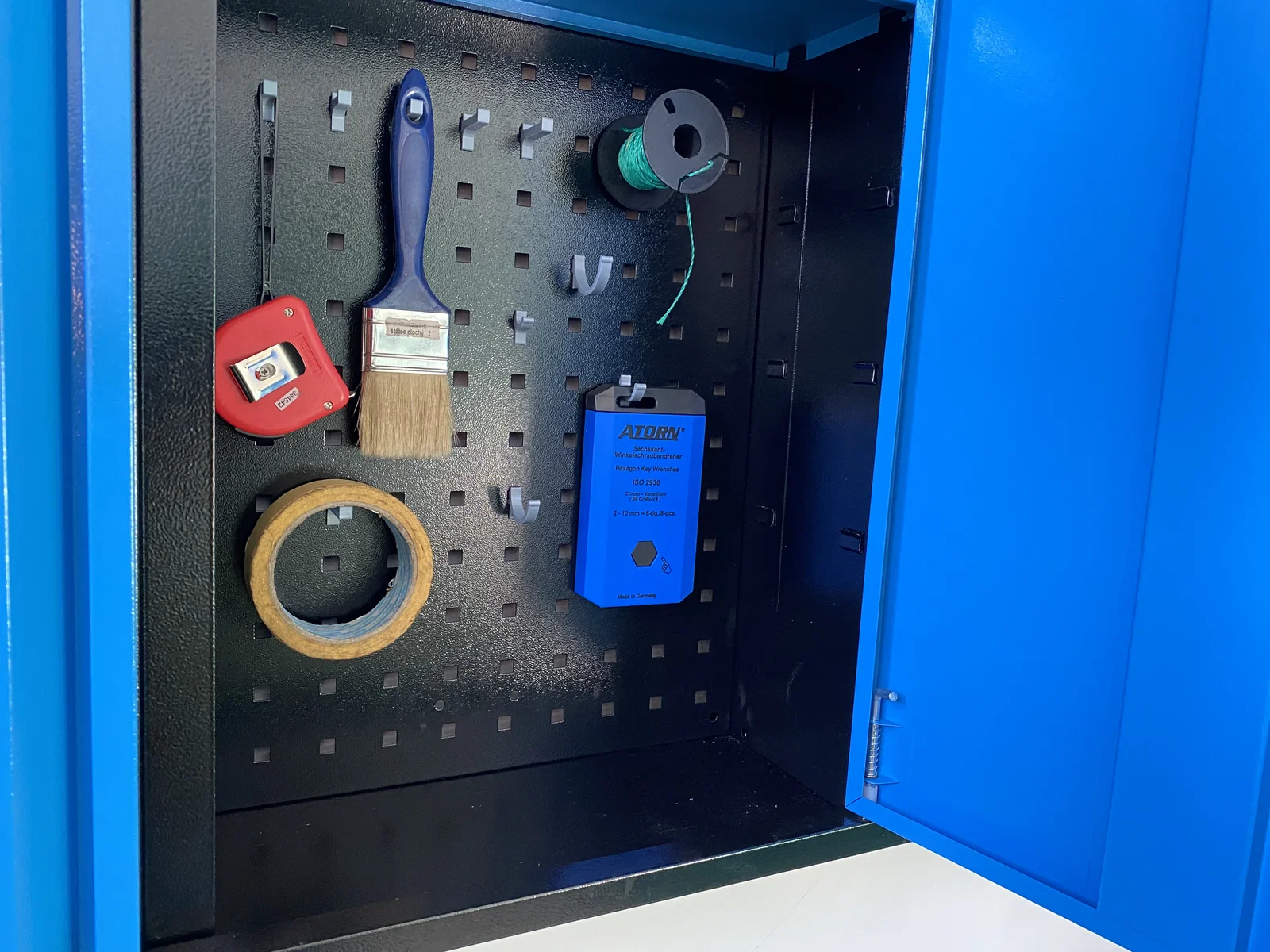 Bộ hák nhiều kích thước và hình dạng khác nhau để gắn vào tủ/khung treo dụng cụ. Trường hợp của mình là tủ GÜDE, mặt sau có các lỗ 9x9mm. Phần thân hák được luồn phần trên vào lỗ này, rồi phía dưới bấm nhẹ để nó cài khớp vào.