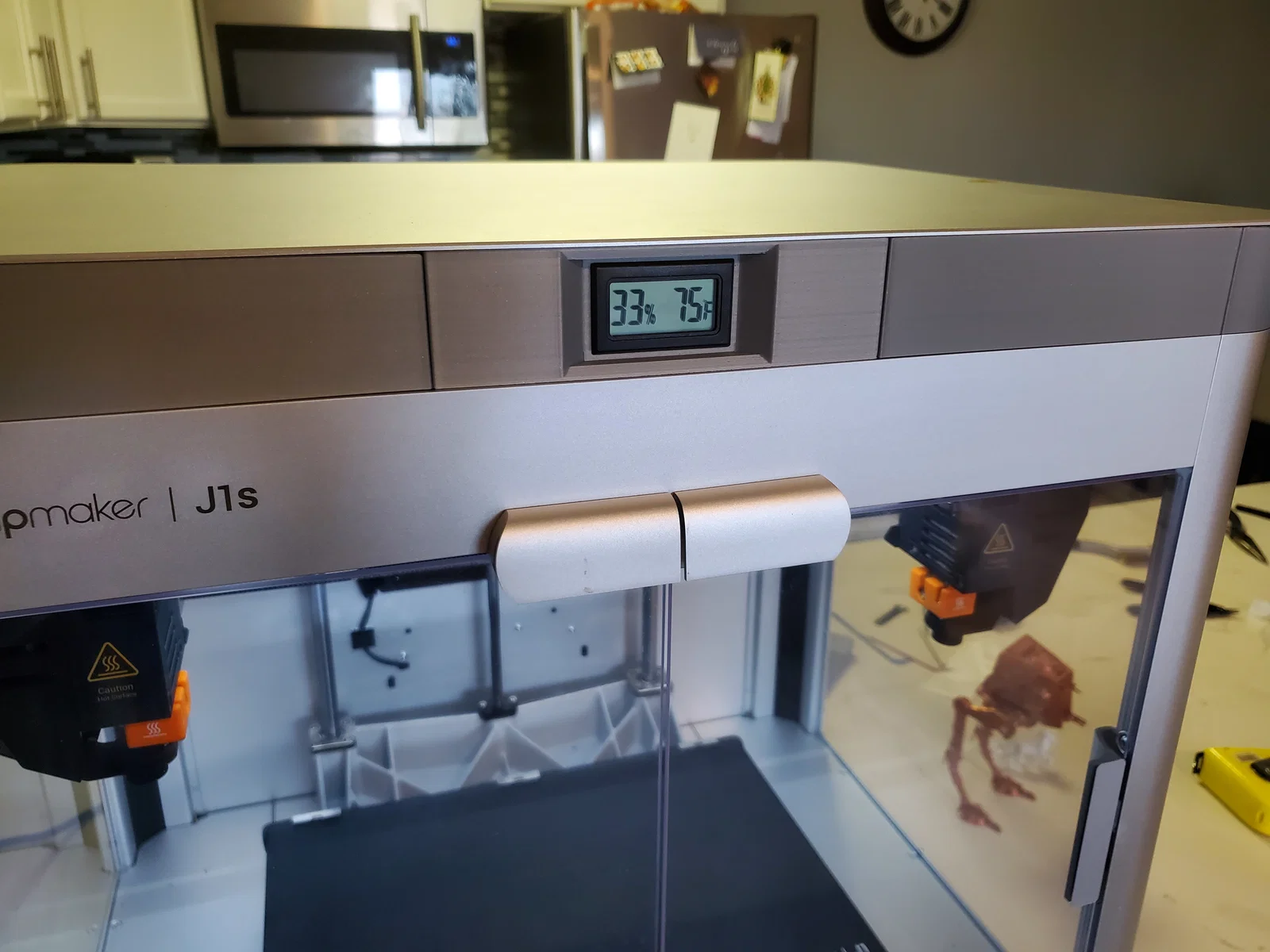 In miếng side kiểu “Thermo Window” sẽ khó hơn do bị overhang. Mình dùng vật liệu Snapmaker breakaway với tree supports (xem ảnh) cho phần đó để bridging rất sạch, và cái hygrometer bấm vào vừa khít luôn!