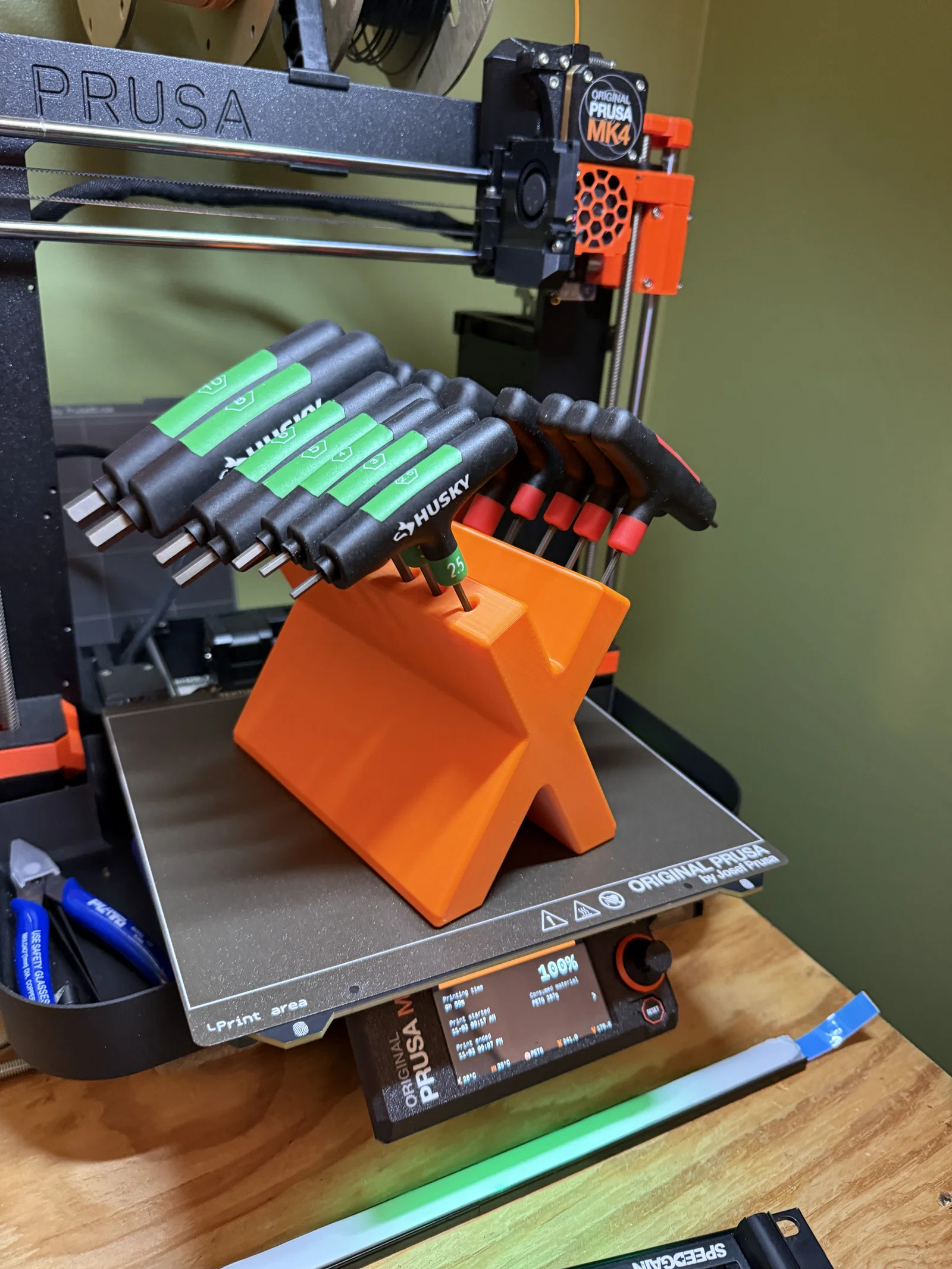 Giá đỡ (holder) cho bộ T-handle hex wrench/allen key, thiết kế vừa bộ Husky 14 món. Khuyến nghị in Polymaker PETG, dùng brim chống warping; infill 5–10% là đủ, giúp tiết kiệm thời gian và filament.