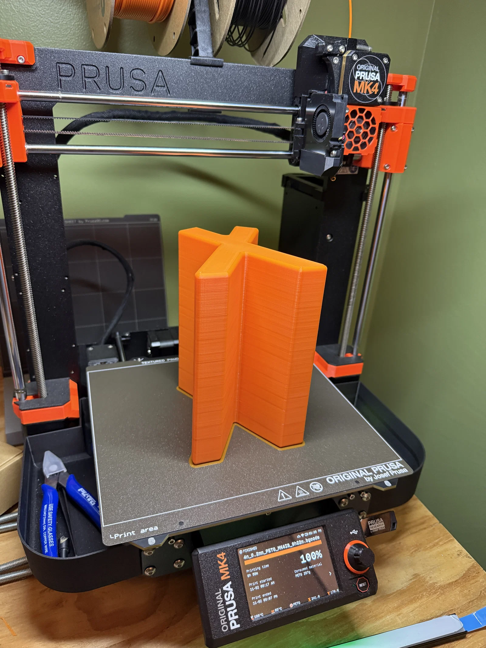 Mình in bằng Polymaker PETG. Mình phải dùng brim để tránh cong vênh (warping) ở lớp đầu. Mình in 10% infill, nhưng thấy nó chắc hơn mức cần thiết nhiều; mình nghĩ bạn có thể giảm xuống 5% để tiết kiệm chút thời gian và filament.