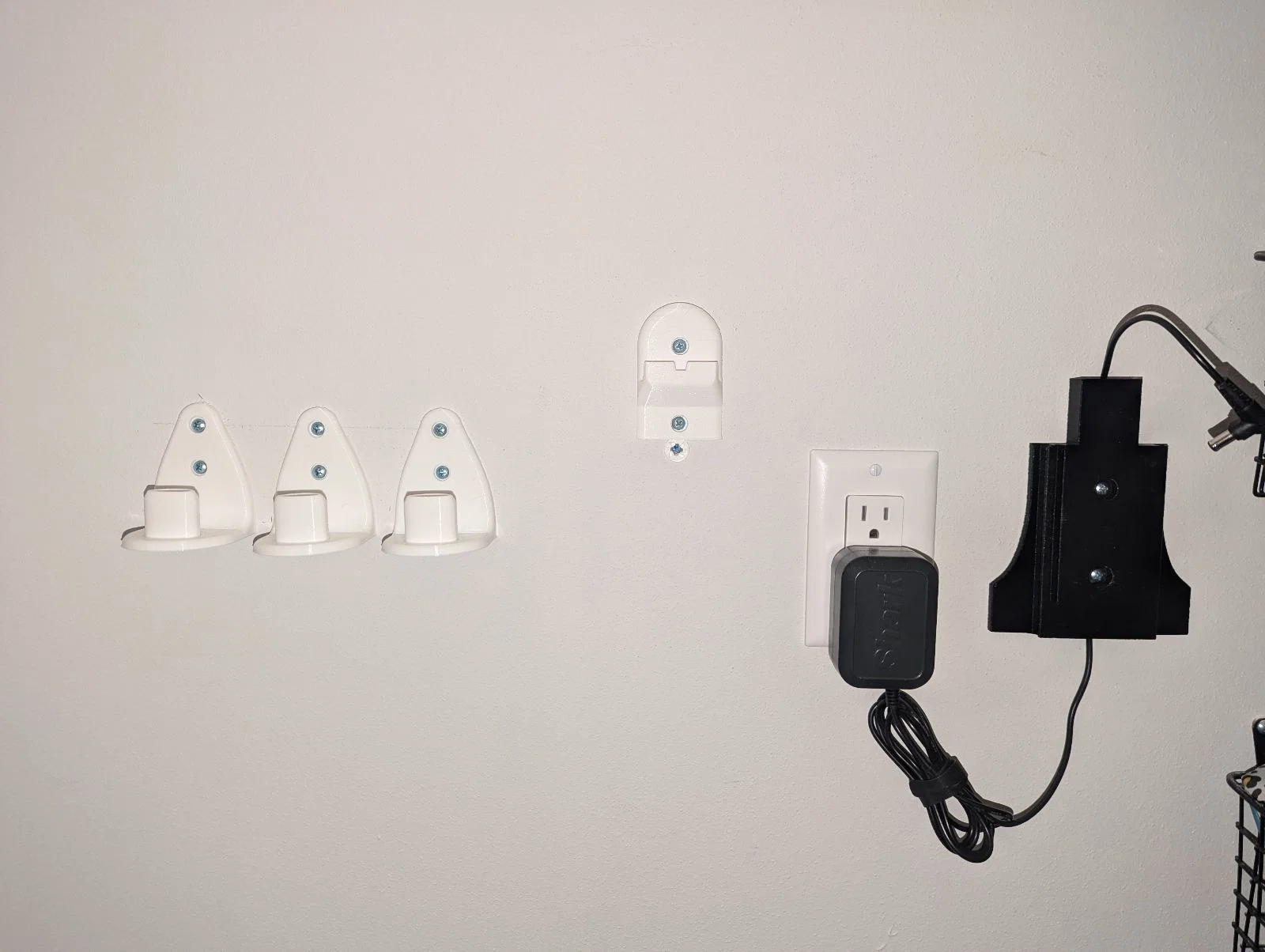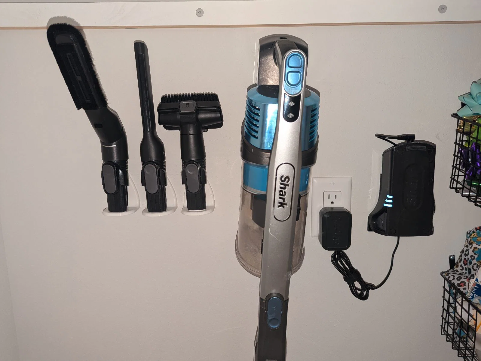 Treo máy hút bụi Shark Vertex và các phụ kiện lên tường, gọn gàng và không vướng víu với các bản in này. Trước đây mình không có giải pháp cất trữ tốt cho máy khi không dùng, thậm chí còn có một món phụ kiện bị thất lạc mà không hay biết do nằm lẫn trong đống đồ dưới sàn tủ quần áo. Giờ thì mọi thứ được treo ngăn nắp trên tường trong tủ.