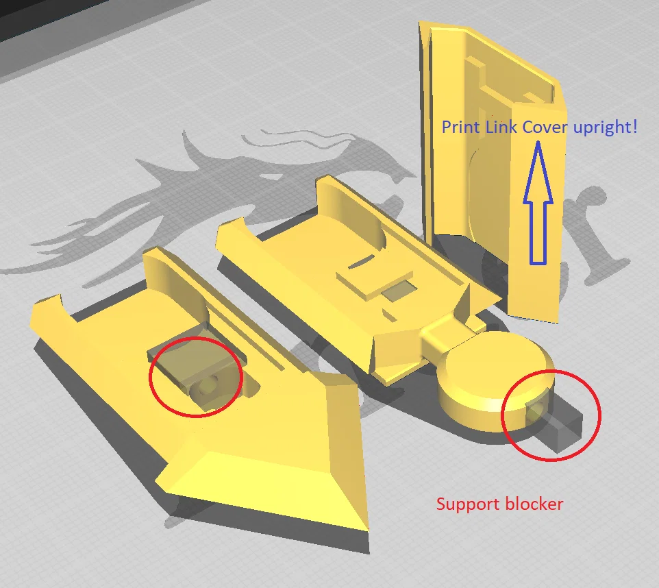 Phần “Links” và “End link” có thể in nằm ngang, nhưng nhớ thêm support blocker ở các lỗ, không là gỡ support sẽ rất cực và mặt trong sẽ bị nhám. Phần “Link Cover” nên in DỰNG ĐỨNG để chi tiết chắc hơn và không bị gãy khi bấm các phần vào với nhau.
