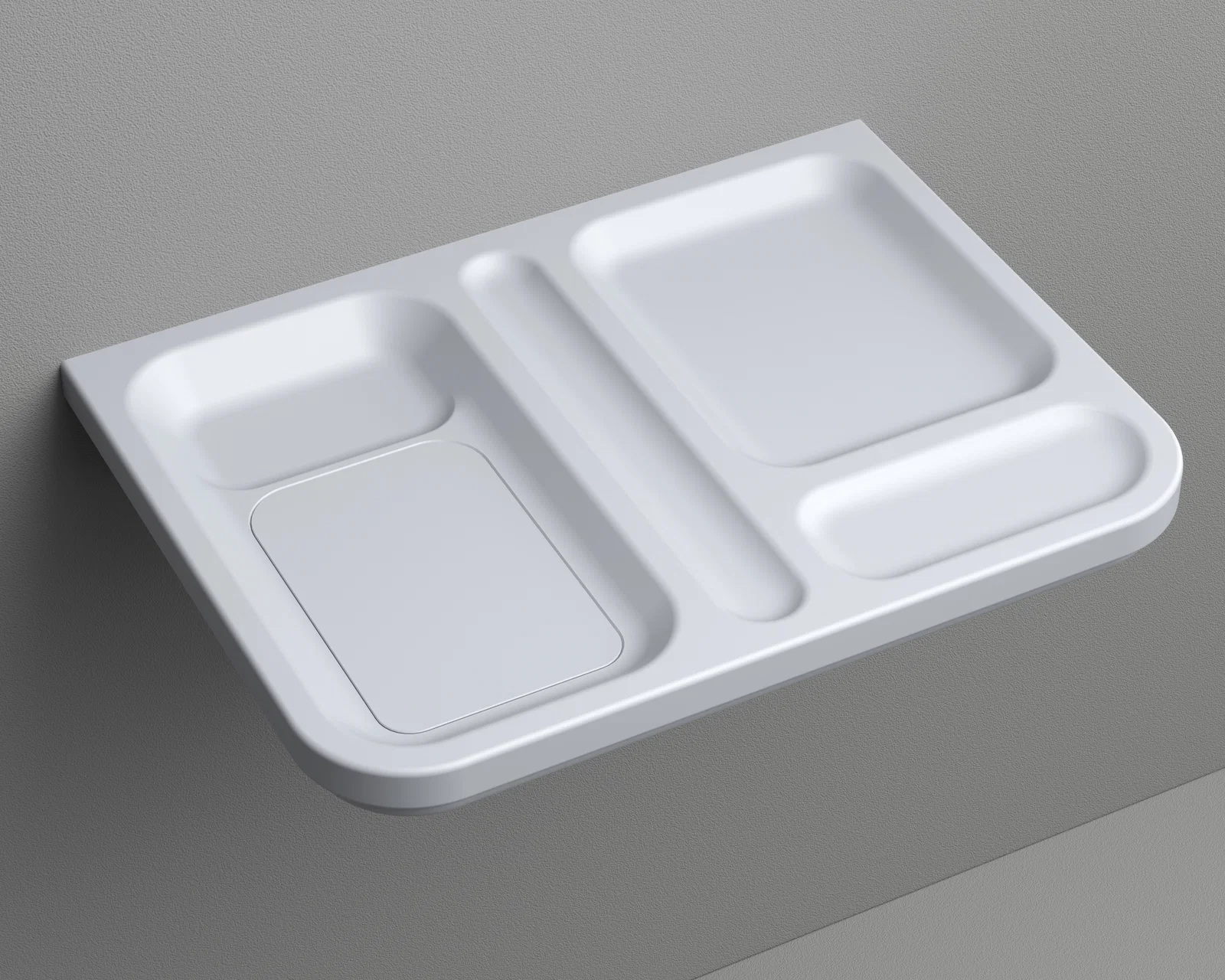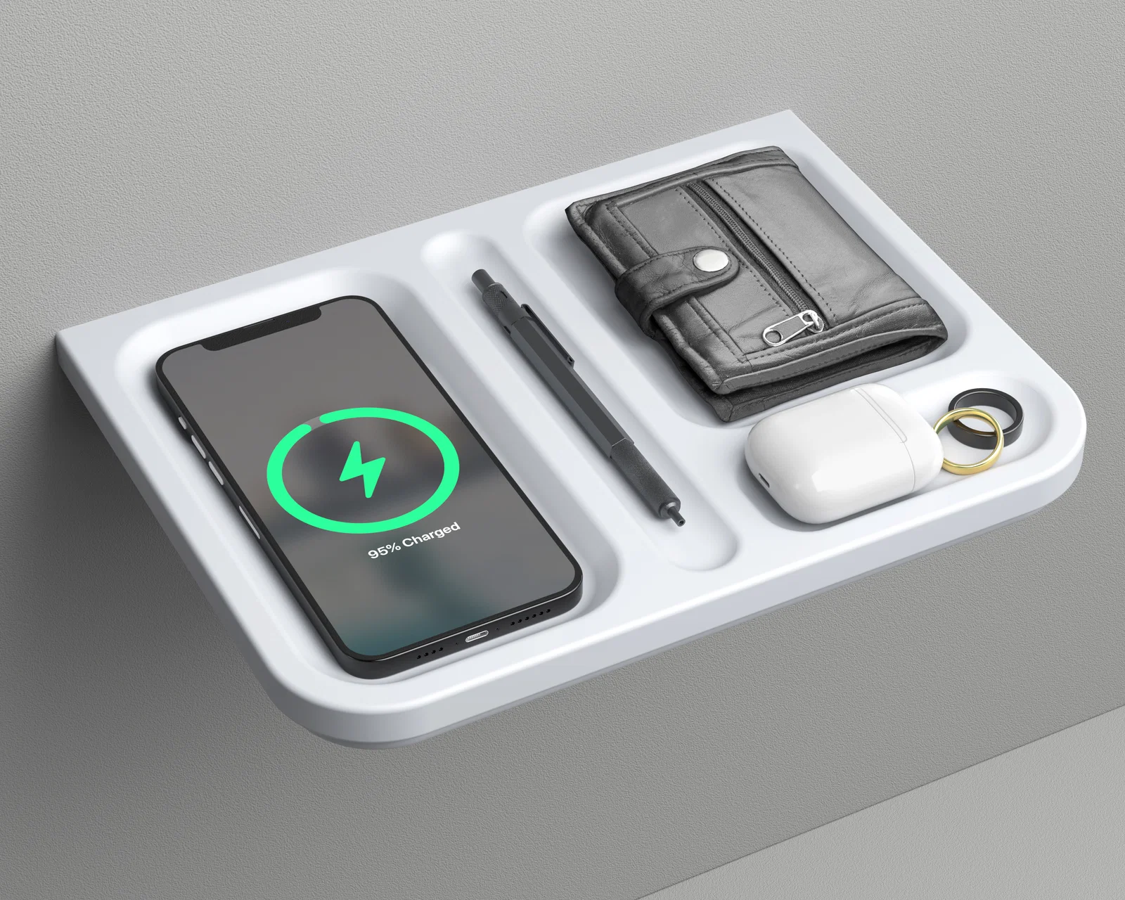 Kệ catch-all tích hợp sạc không dây gắn tường ngay trên ổ điện, giúp sạc iPhone Max/Plus gọn gàng và để EDC ngăn nắp. v2.0 nhỏ hơn, in được trên Prusa Mk3/Mk4, gắn bằng Command strips dễ tháo không hư tường.