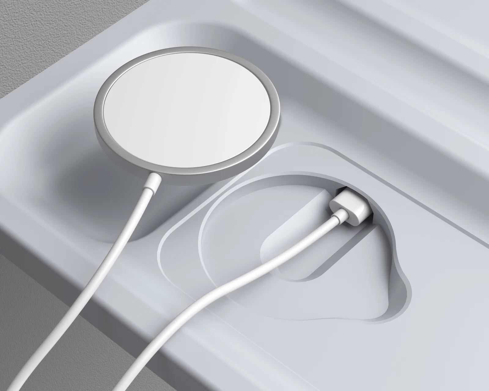 - Luồn dây của sạc MagSafe qua lỗ ở phía trên của kệ và cho dây đi ra phía sau.