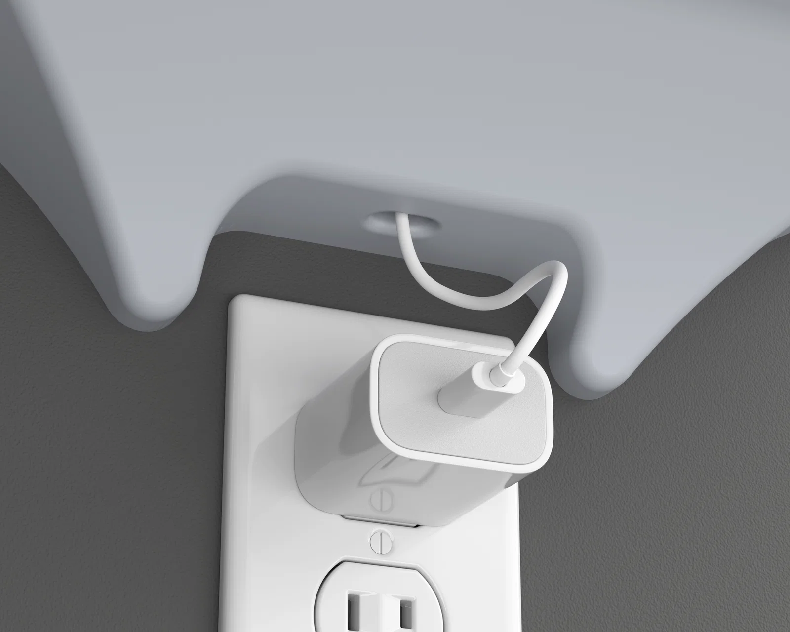 - Cuối cùng, trượt kệ trở lại vị trí phủ lên shelf mount và cắm dây sạc với wall adaptor.