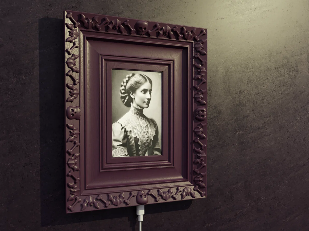 Một chiếc khung điện thoại phong cách cổ điển được trang trí bằng các họa tiết đậm chất Halloween. Bạn có thể dùng nó làm khung ảnh hoặc để troll bạn bè trong dịp lễ Halloween này. Mình đã tạo một video hoạt họa đơn giản mà bạn có thể phát trên điện thoại rồi đặt vào khung, hoặc bạn cứ thoải mái sáng tạo đặt bất cứ thứ gì mình thích vào đó.