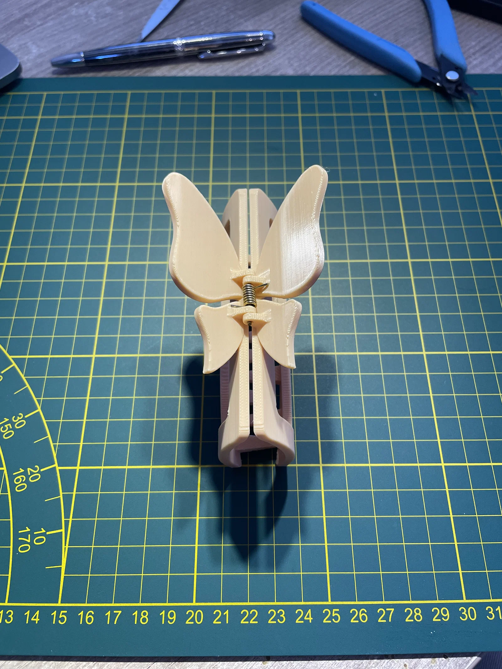Mẫu 3D kẹp tóc hình con bướm. Để lắp ráp, bạn cần tận dụng lò xo và thanh kim loại từ một kẹp tóc bị hỏng. In với supports snug và đặt đúng orientation như hình để hạn chế vết support khi dùng.