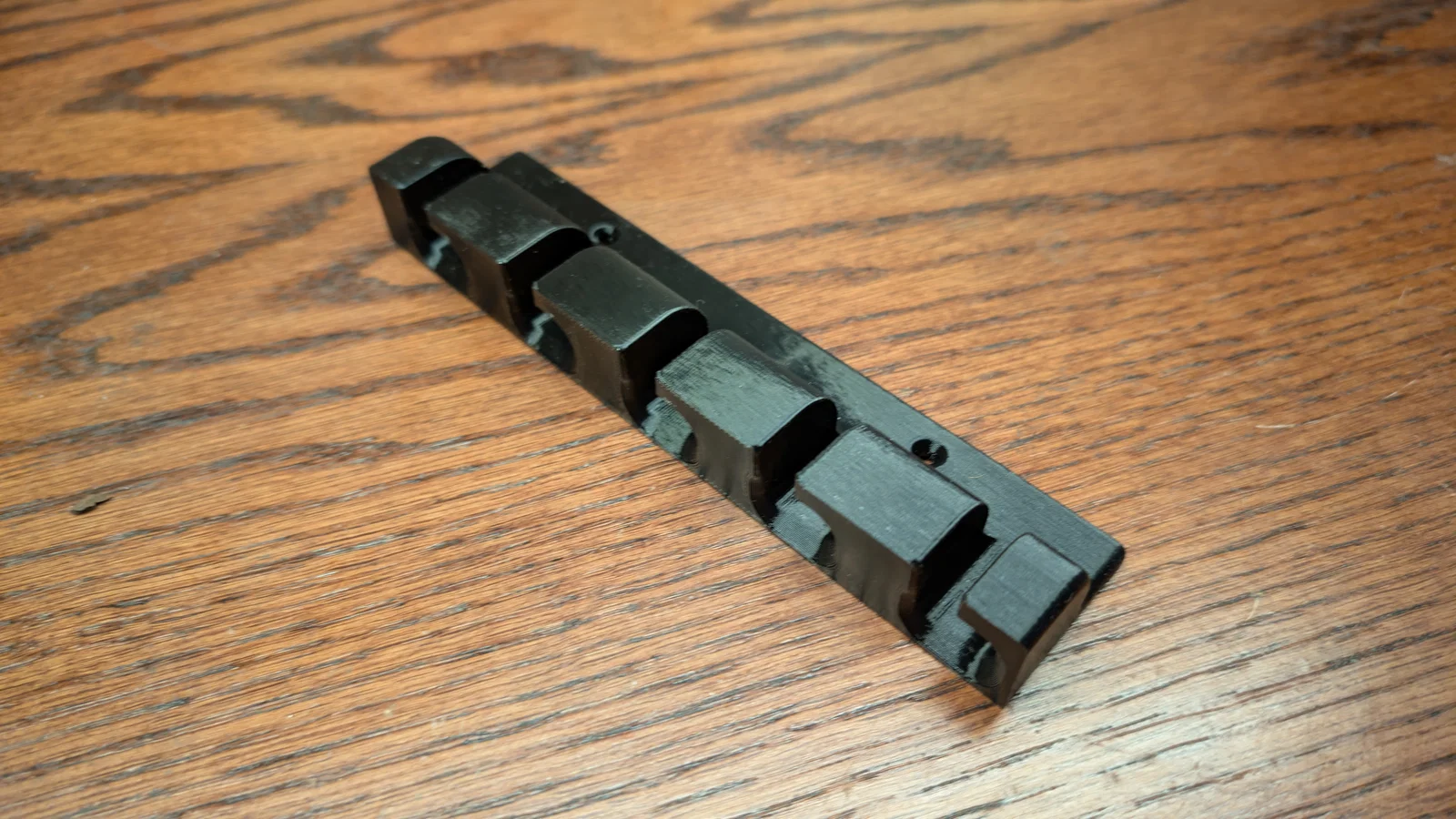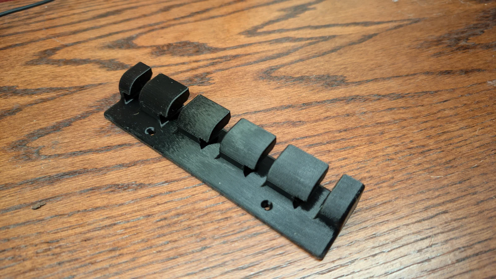 Đây là một bộ organizer chắc chắn, được thiết kế để giữ gọn các dây cho laptop của mình khi mình rời khỏi bàn làm việc. Mẫu có các lỗ bắt vít 3mm dạng countersunk, nhưng mình đang dùng miếng dán 3M Command Strips để cố định tại chỗ nhằm tránh làm hư mặt bàn.