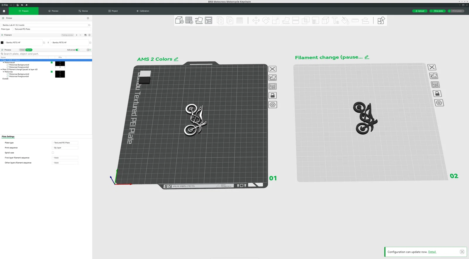 - Kỹ thuật in 2 màu: Bạn có thể sử dụng hệ thống AMS (Automatic Material System) để đổi màu tự động hoặc tạm dừng in (filament change pause) tại lớp thứ 63 để thay đổi màu nhựa, tạo ra sự tương phản giữa khung xe và các chi tiết.