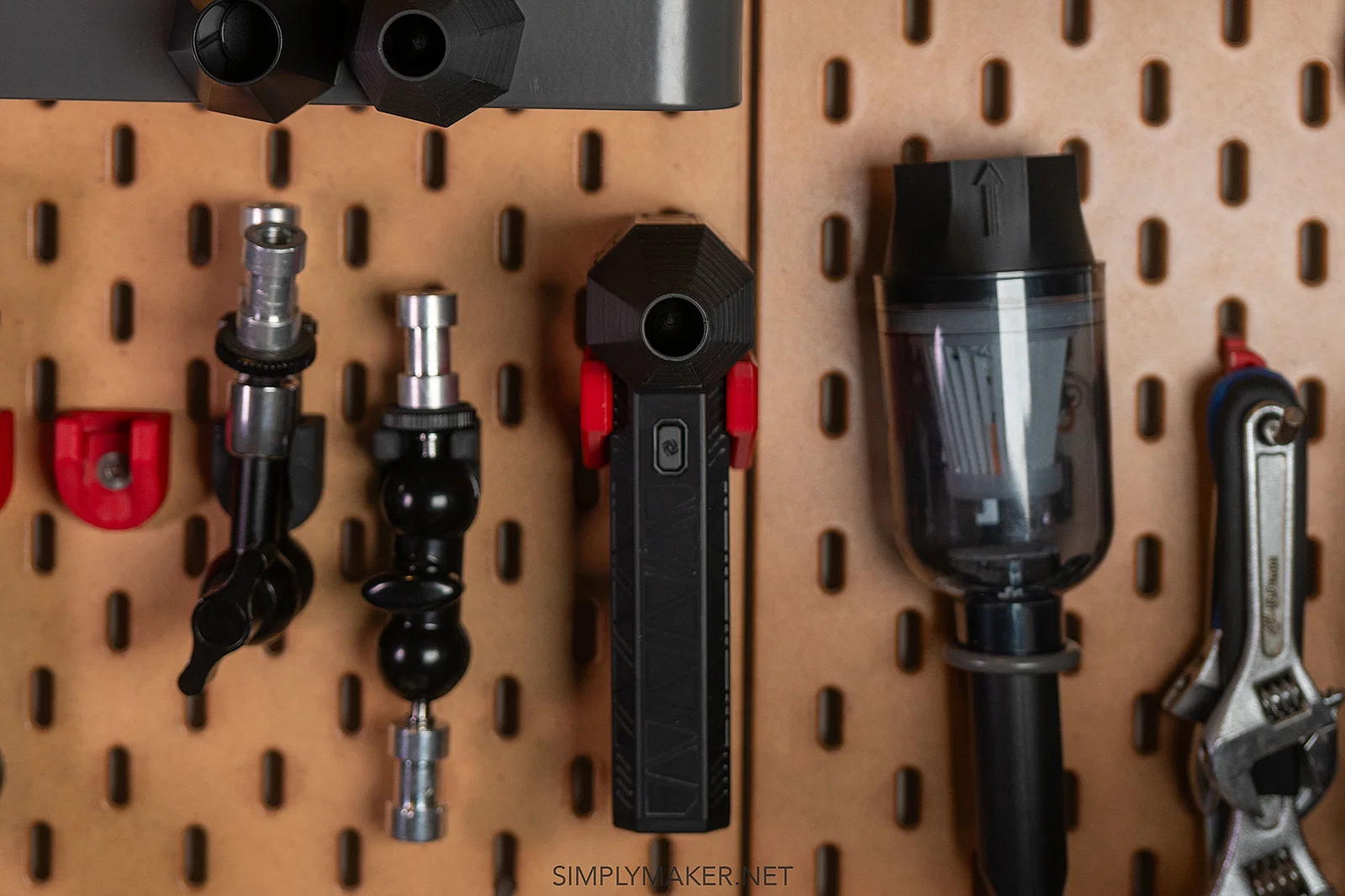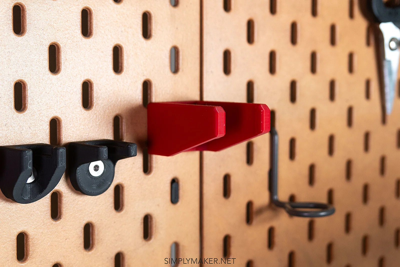 Nếu muốn lắp dowel ở vị trí giữa pegboard, bạn có thể cần thêm điểm đỡ phía sau để tránh bị cong khi đẩy vào. Mình có thiết kế một IKEA SKÅDIS backer/spacer để việc lắp đặt dễ dàng hơn.