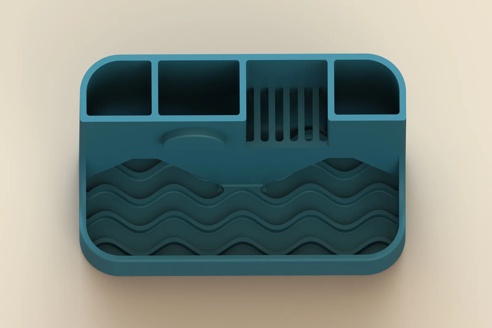 Organizer này được thiết kế để in 3D, có các khoảng khoét để dễ vệ sinh sạch mọi ngóc ngách. Mình không muốn làm 2 hay nhiều phần vì sợ lắp lâu ngày sẽ bị lỏng. Tuy vậy, nếu bạn thích thì vẫn có thể tách mẫu ra và làm bản 2 mảnh dạng snap-fit để vệ sinh cái khay đáy còn dễ hơn.