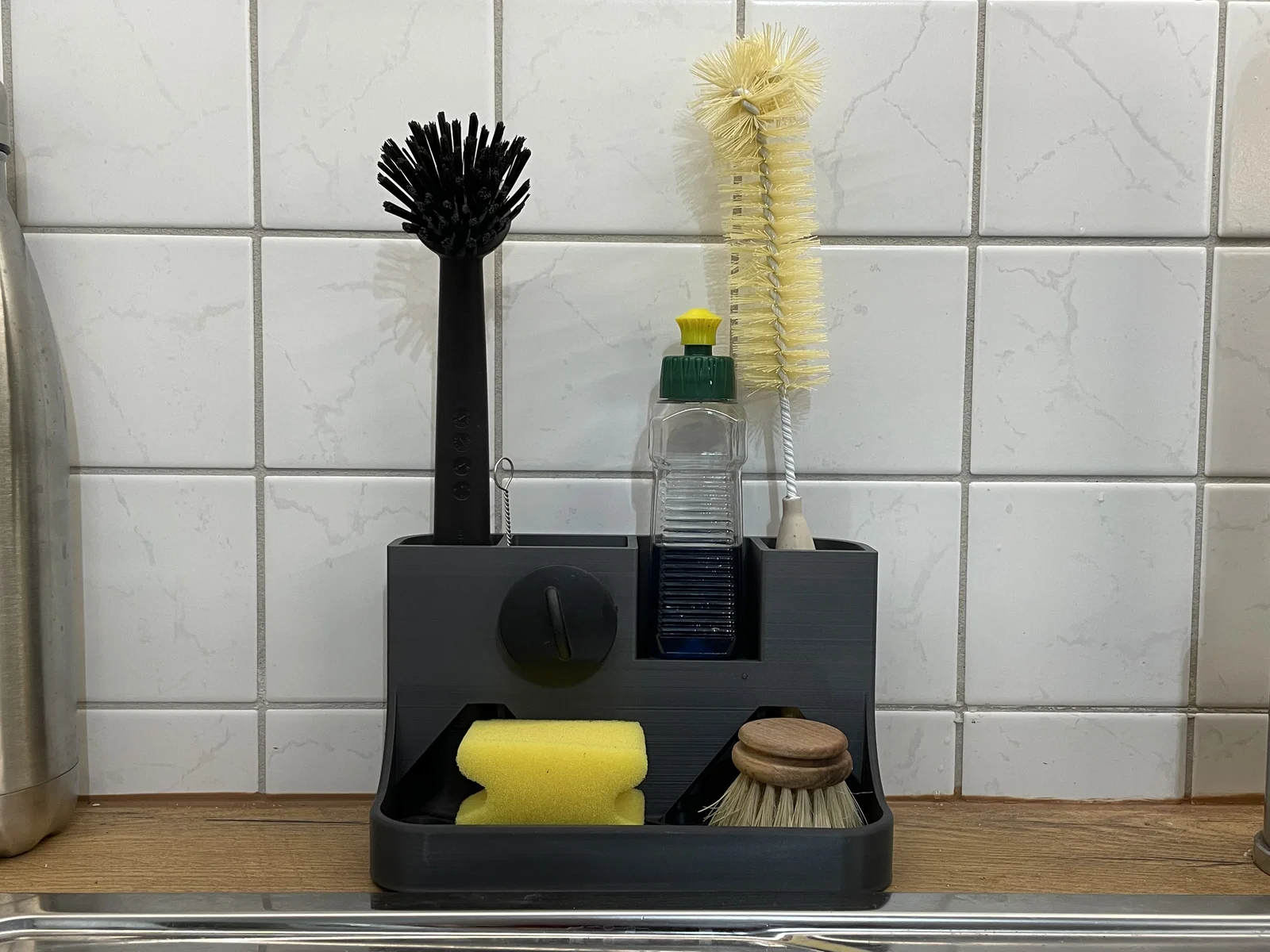 Organizer nhỏ gọn mà tiện dụng cho bồn rửa chén, vừa khoảng trống 10cm giữa bồn và tường. Thiết kế cứng cáp, thành dày, có rãnh thoát nước giúp sponge/bàn chải mau khô, in không cần support và có chỗ để nút chặn nước.