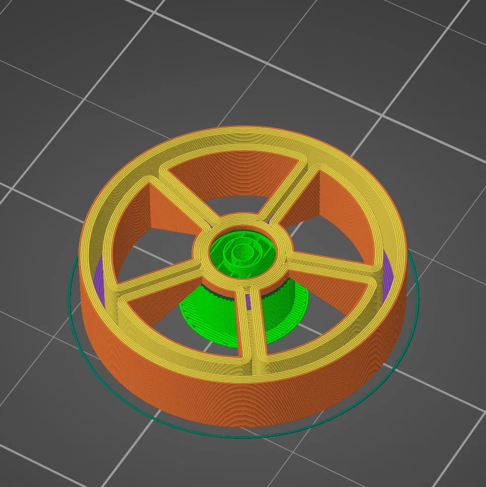 - 6 layers, 0% infill – mình thử vài kiểu infill thì bánh bị mất cân bằng vì pattern không đồng đều tuyệt đối khắp nơi. Nên mình chọn tăng số perimeter và để 0% infill để bánh nhẹ, có chút đàn hồi nhưng vẫn giữ độ cứng và cân bằng.