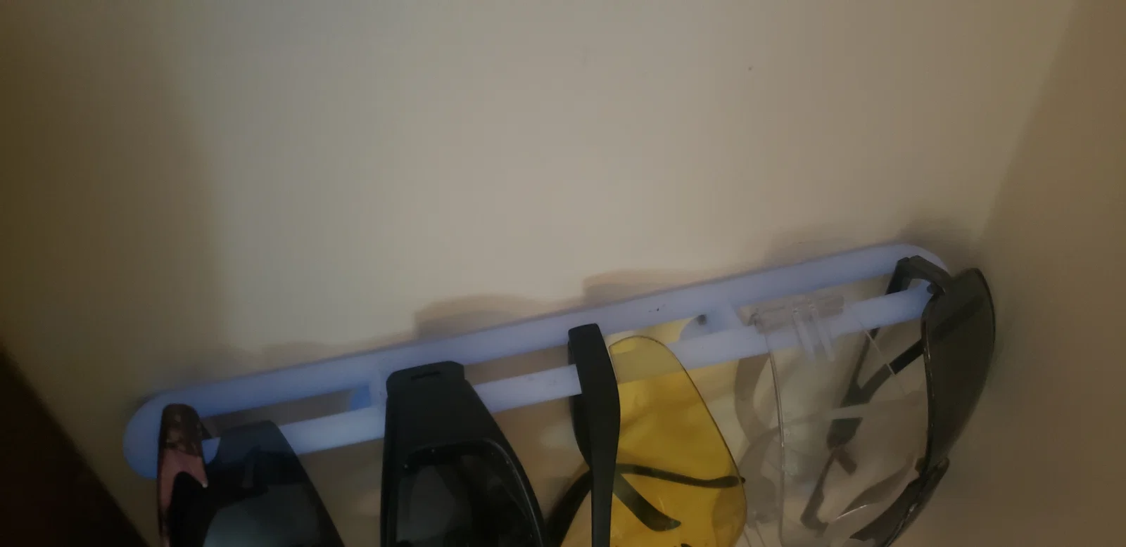 Một cách đơn giản mà hữu ích để cất kính gọn gàng, tránh vướng víu và hạn chế trầy tròng. Cũng rất tiện để treo safety glasses, kính mát và kính cận nữa! Bạn có thể dùng vài con vít nhỏ hoặc băng keo dán hai mặt để cố định. Ban đầu mình thiết kế với ý định để lỗ bắt vít nằm phía trên mẫu, nhưng sau đó mình chọn cách lắp ngược để luồn càng kính vào holder dễ hơn (và nhìn cũng gọn hơn khi lỗ bắt vít nằm bên dưới mẫu). Đảm bảo làm bác sĩ đo mắt của bạn không vui!