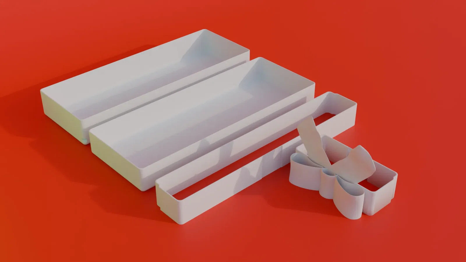 Hộp quà dáng dẹt, thuôn dài này có nắp và thân tách rời, được thiết kế để lắp khít với nhau. Hộp được cố định bằng hai dải ribbon: một dải quấn ngang theo bề rộng và dải còn lại vắt dọc theo chiều dài, giúp đóng chắc chắn và tạo điểm nhấn sang trọng.