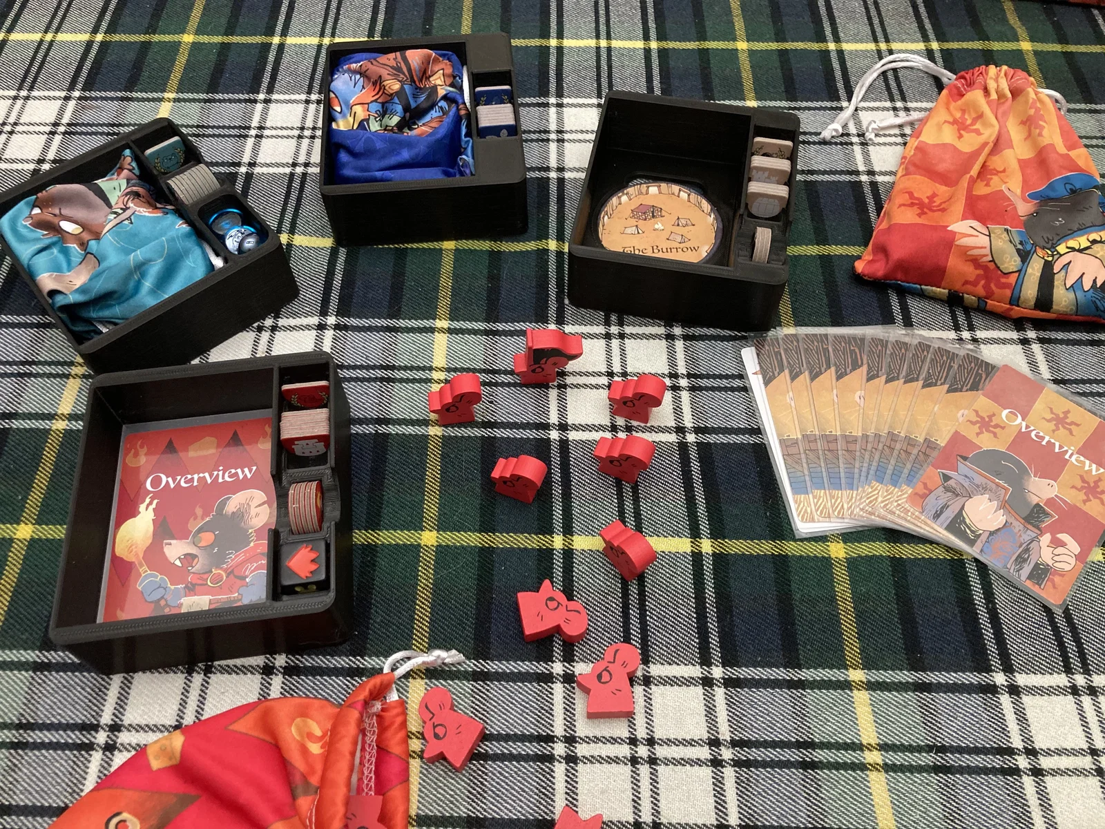 hirelings_animals.stl- giữ hirelings; có chỗ cho 8 nhưng hiện chỉ dùng 6; hy vọng 2 chỗ còn lại sẽ được lấp trong expansion tương laihirelings_badgers.stl- pawn badger plus token Vault Buildinghirelings_base.stl- hireling cards, end-of-turn markers, và hireling control markershirelings_bear_stag_otters.stl- paw của Exile, Flotilla, và Protector, plus Club tokenshirelings_bunnies_hedgehogs.stl- trong một cái mình để pawn bunny cộng Uprising die, còn cái thứ hai mình ghép pawn hedgehog với Hireling Control diehirelings_landmarks.stl- landmark cards và pawnshirelings_moles.stl- pawn mole plus Foothold tokens