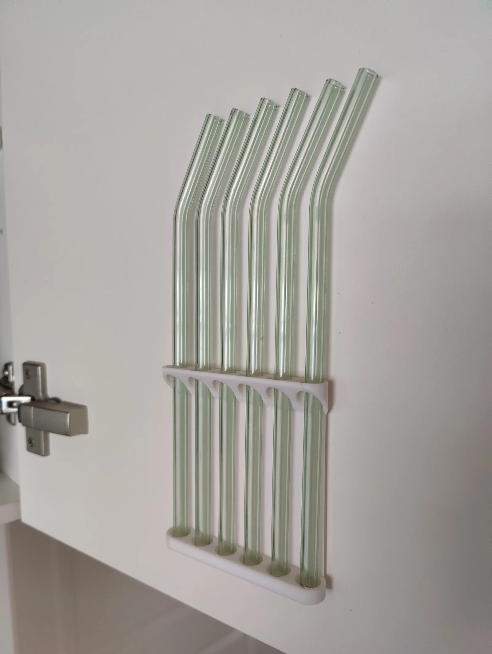 Mẫu Glass Drinking Straw Holder để gắn ống hút lên bề mặt phẳng như mặt trong tủ bếp. Phiên bản này đã bỏ điểm gắn cho máy rửa chén và kéo dài backplate, giúp dán bằng băng keo hai mặt và đỡ ống hút chắc hơn.