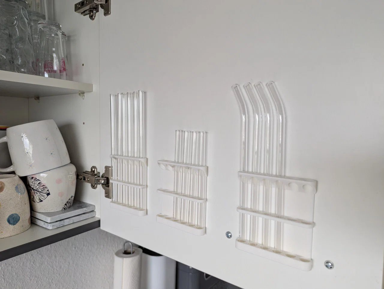 Giá giữ ống hút thủy tinh/kim loại để gắn trong tủ bếp, có thêm guide ở giữa giúp ống hút không bị trượt ra bên hông khi đưa vào. Lỗ đáy sâu hơn để chống tuột; in nằm ngửa, không cần support.