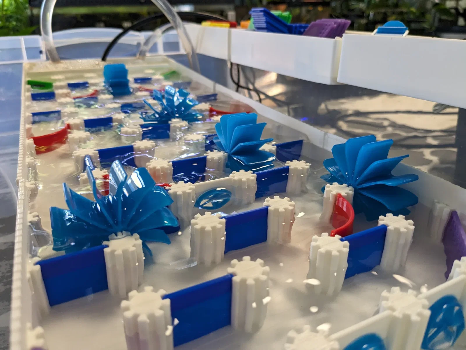 Nói về mấy miếng flap: tuy cả stream table này kiểu như “Phillips Machine cho trẻ em” phiên bản dễ chơi, nhưng riêng mấy miếng flap dùng cực kỳ đã cho fluidics đơn giản. Thật sự bất ngờ vì hệ có thể chính xác/chi tiết đến mức nào. Trong hình dưới, chỉ cần lật miếng màu tím có mũi tên kế bên là nó ổn định chuyển qua chuyển lại turbine nào (trong 2 cái có mũi tên) sẽ quay. 🤯