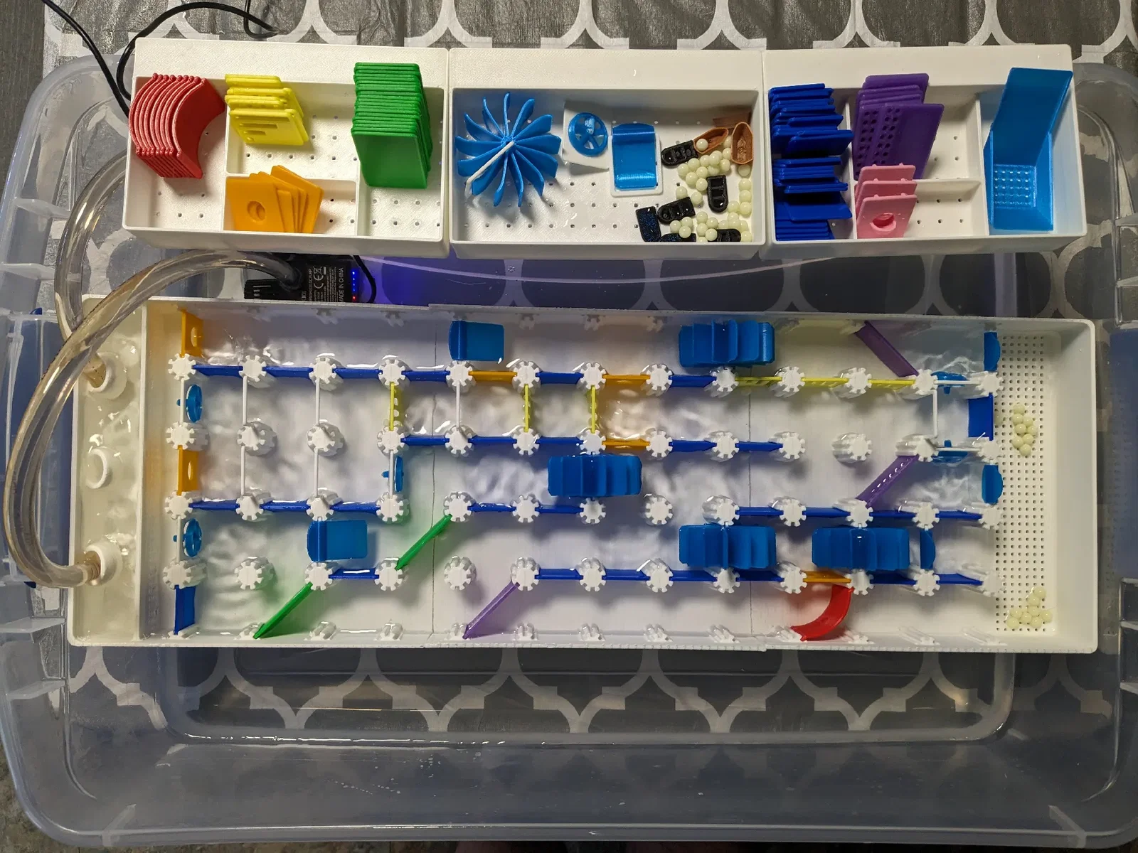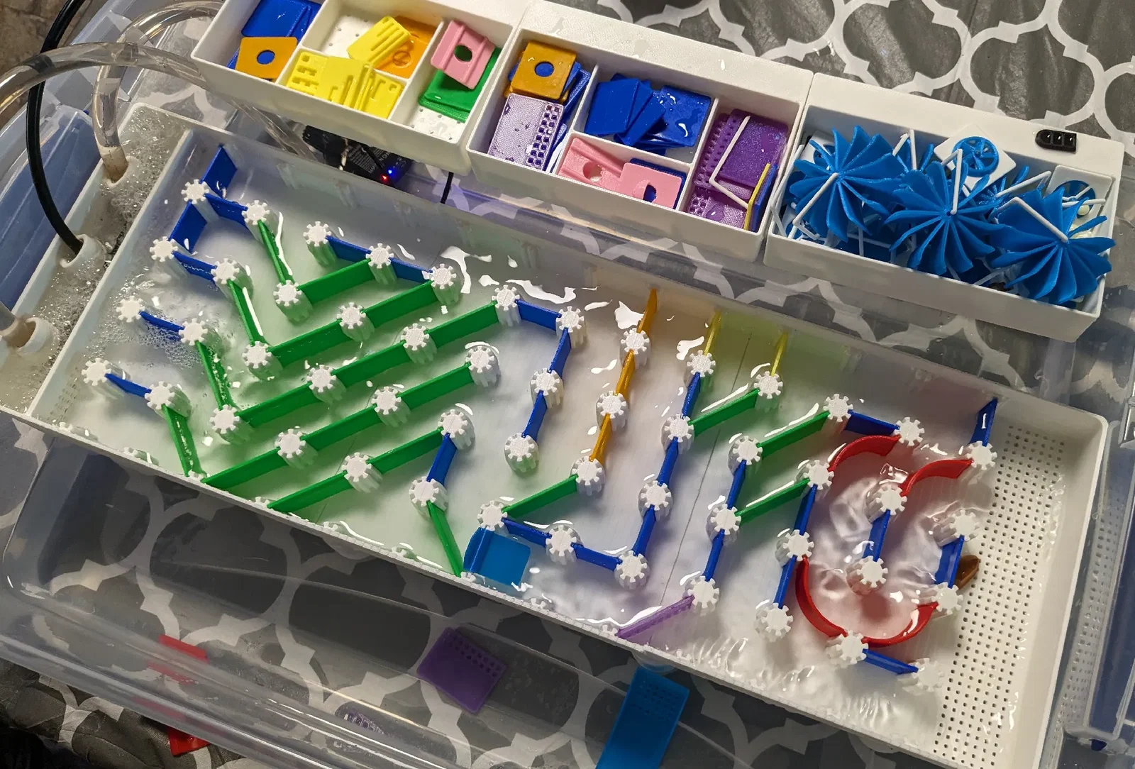 Mình cố thiết kế một bộ “miếng gài” (slot-in pieces) khởi đầu cho ổn. Mỗi miếng đều có mục đích để bạn tự khám phá. Chỉ cần mấy miếng “vuông” và chữ nhật cơ bản là đã vui rồi, nhưng mình muốn thêm lựa chọn để tạo hệ thống phức tạp hơn (và nhiều màu hơn), có nhiều cách bóp/hãm rồi mở rộng dòng nước, v.v. Các chi tiết chuyển động—kể cả mấy chiếc thuyền hơi ngố—rất hợp để quan sát dòng chảy (hoặc chỗ bị tù). Nếu ai đó thấy bực vì một thứ không chạy như mong muốn thì cũng bình thường, đó là một phần của quá trình học. Chỉ cần dịch một miếng thôi cũng có thể tạo khác biệt rất lớn, và nhìn ai đó từ chỗ chưa “bắt sóng” mà tự mày mò ra được thì đã lắm. Mình dự định sẽ thêm nhiều miếng theo thời gian và cũng mong người khác đóng góp thêm.