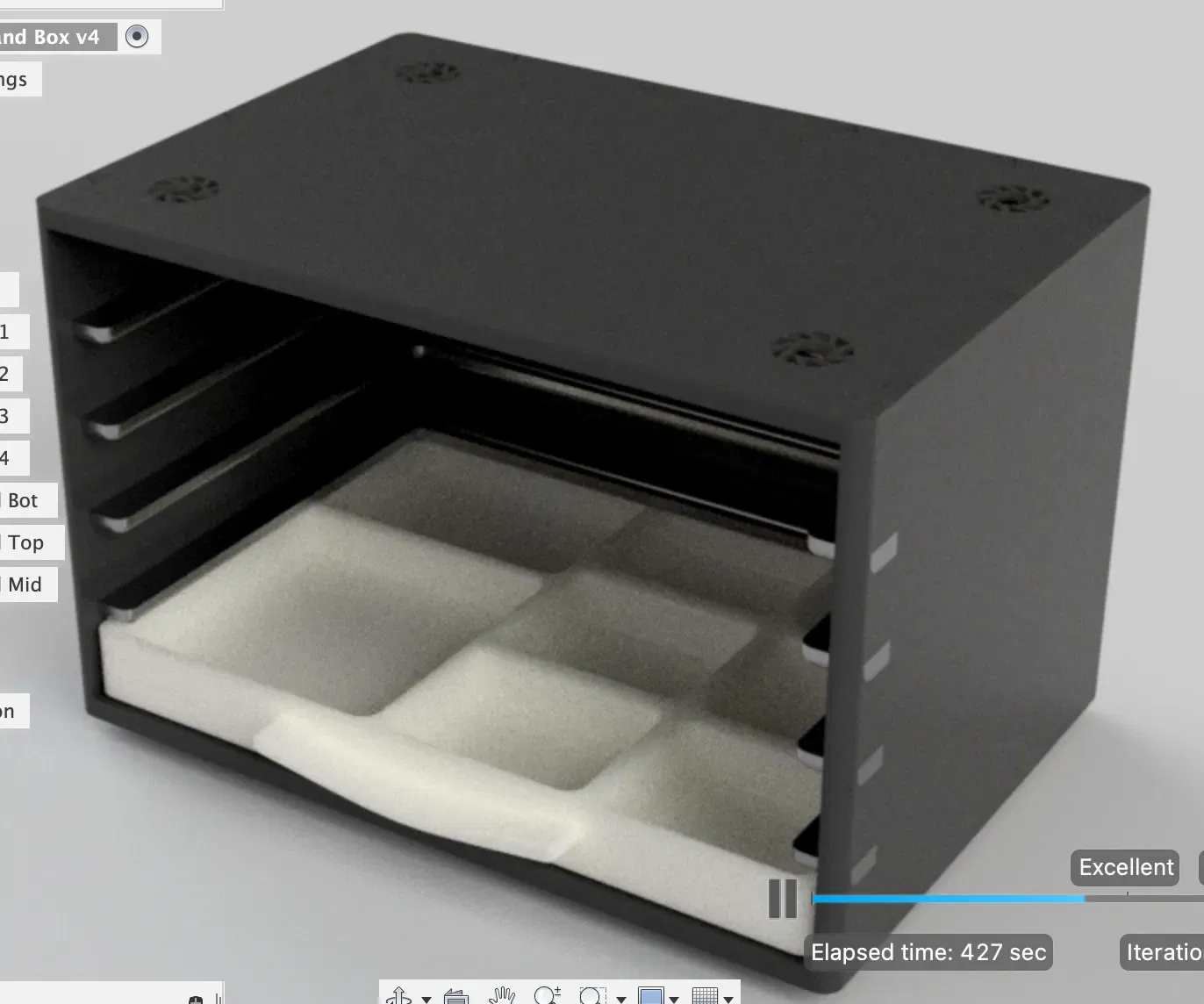 Tôi đã thiết kế chiếc hộp này để chứa các bộ phận đồng hồ nhỏ. Nó khá nhỏ, nhưng tiết kiệm rất nhiều không gian trên kệ chế tạo đồng hồ của tôi! Có một rãnh ở phía sau của các thanh ray và khay để ngăn các khay bị trượt ra ngoài một cách tình cờ.