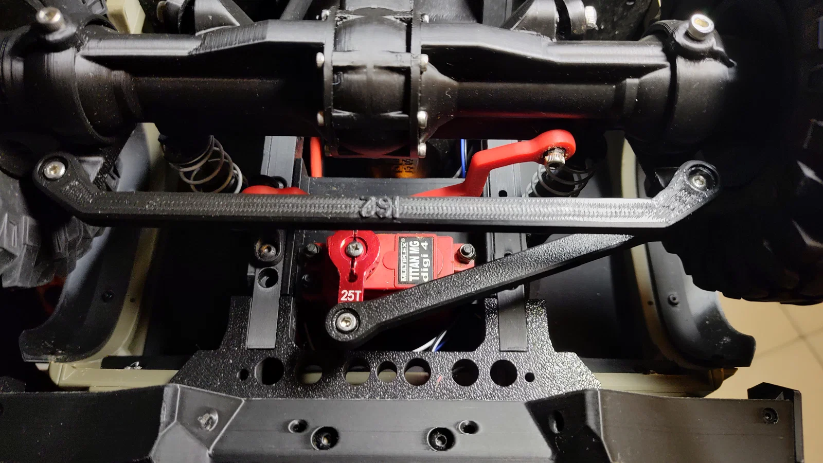 Note 1: chiều dài steering rod có thể sẽ khác nhau. Hiện tại mình đang dùng servo horn ngắn và thiết kế steering rod theo nó. Mình có đặt một servo horn “classic” 25T và sẽ cập nhật steering rod khi nhận được