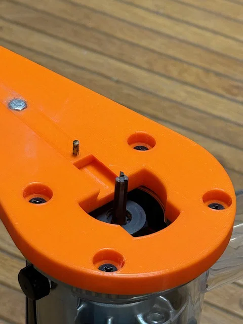 In bằng PLA hoặc PETG. Gắn thêm 1 con ốc M4 kèm đai ốc cánh bướm (butterfly nut). Phần chốt canh tâm (centering pin) mình dùng mũi khoan cũ 3mm, cắt lại cho vừa (khoảng 10 mm) rồi hơ nóng trước khi ép vào đế.