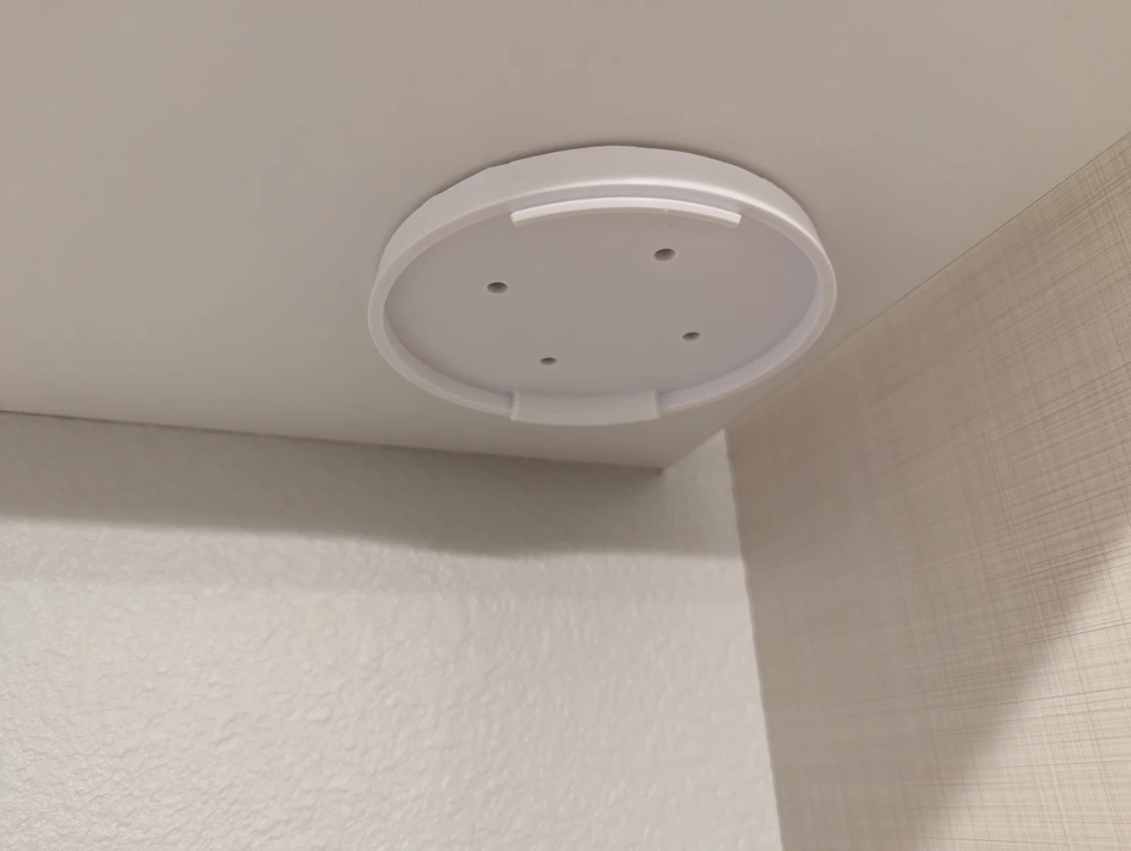 Bạn có thể dùng ốc vít #8 hoặc băng keo hai mặt để gắn tấm đế lên trần nhà.